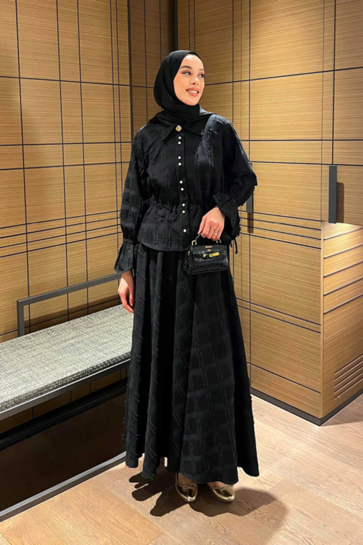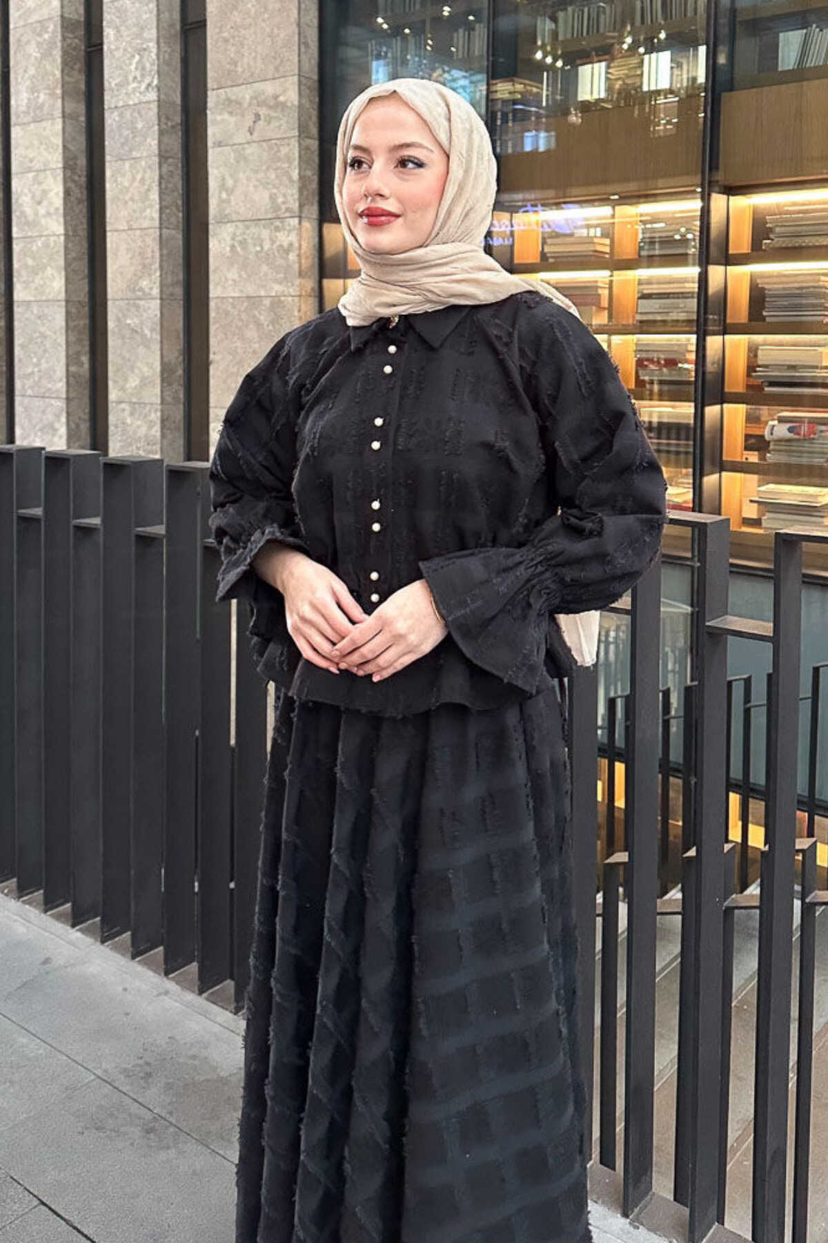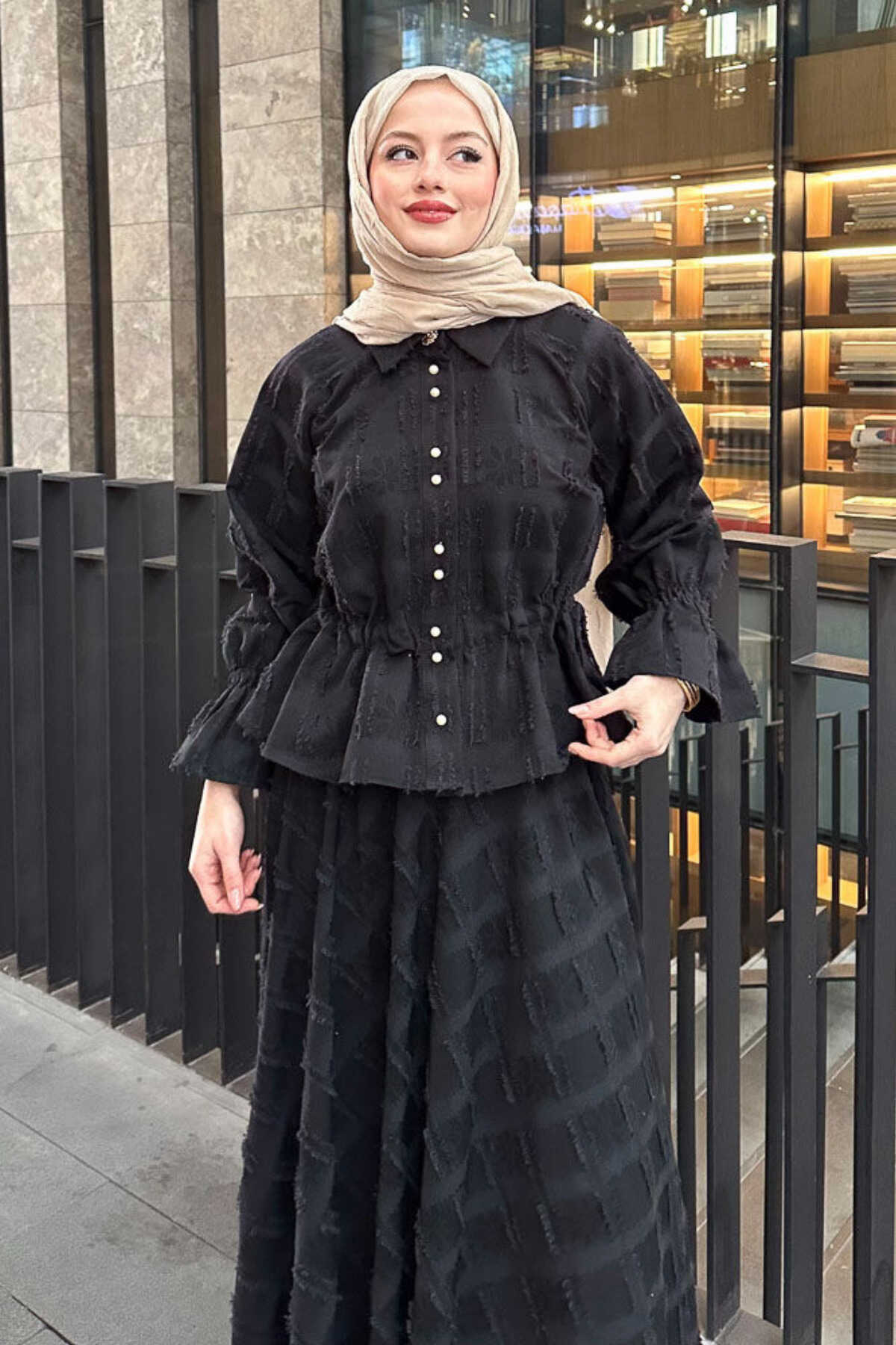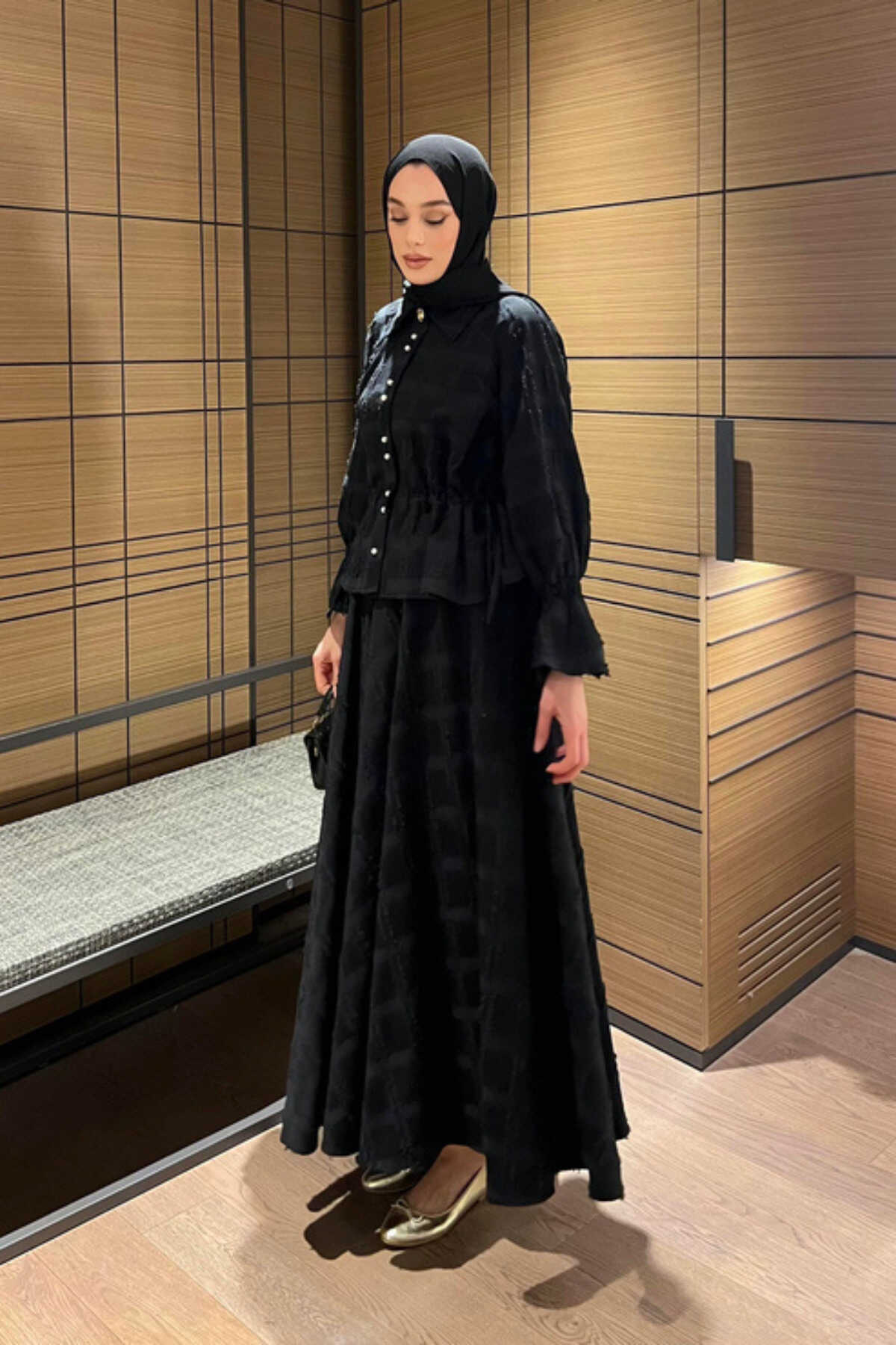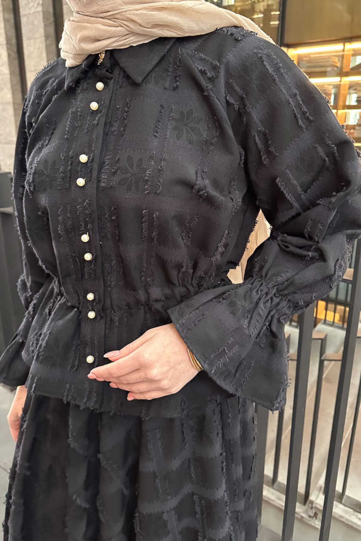 - Klasik ve şık bir görünüm için siyah renkli, düz desenli keten takım.; - Gömlek ve etek olmak üzere iki parçadan oluşan, tesettür giyim koleksiyonuna uygun tasarım.; - Normal bel ve düz paça kesimiyle rahat bir kullanım sunar.; - Standart kol tipi ve gömlek yaka detayları ile zamansız bir stil yaratır.; - İncili düğmeli püsküllü detaylarıyla zarif bir dokunuş katarken, cepsiz tasarımı ile sade bir görünüm sağlar.; - Keten karışımlı dokuma kumaşı sayesinde ince ve hafif yapıya sahip olup, kırışmaya dayanıklıdır.; - Regular kalıp ile vücut hatlarını saran ancak sıkmayan rahat bir oturuşa sahiptir.; - Düğmeli kapama şekli kolay giyilip çıkartılmasını mümkün kılarken uzun kollu tasarım mevsim geçişlerinde idealdir.; - Astarsız yapısıyla hafiflik sunarken, 30 derecede hassas yıkama talimatına uygun şekilde bakımı kolaydır.; - Tüm sezonlar için uygun olan bu takım, gündüzden geceye her ortama uyum sağlar.; - Kemersiz tas