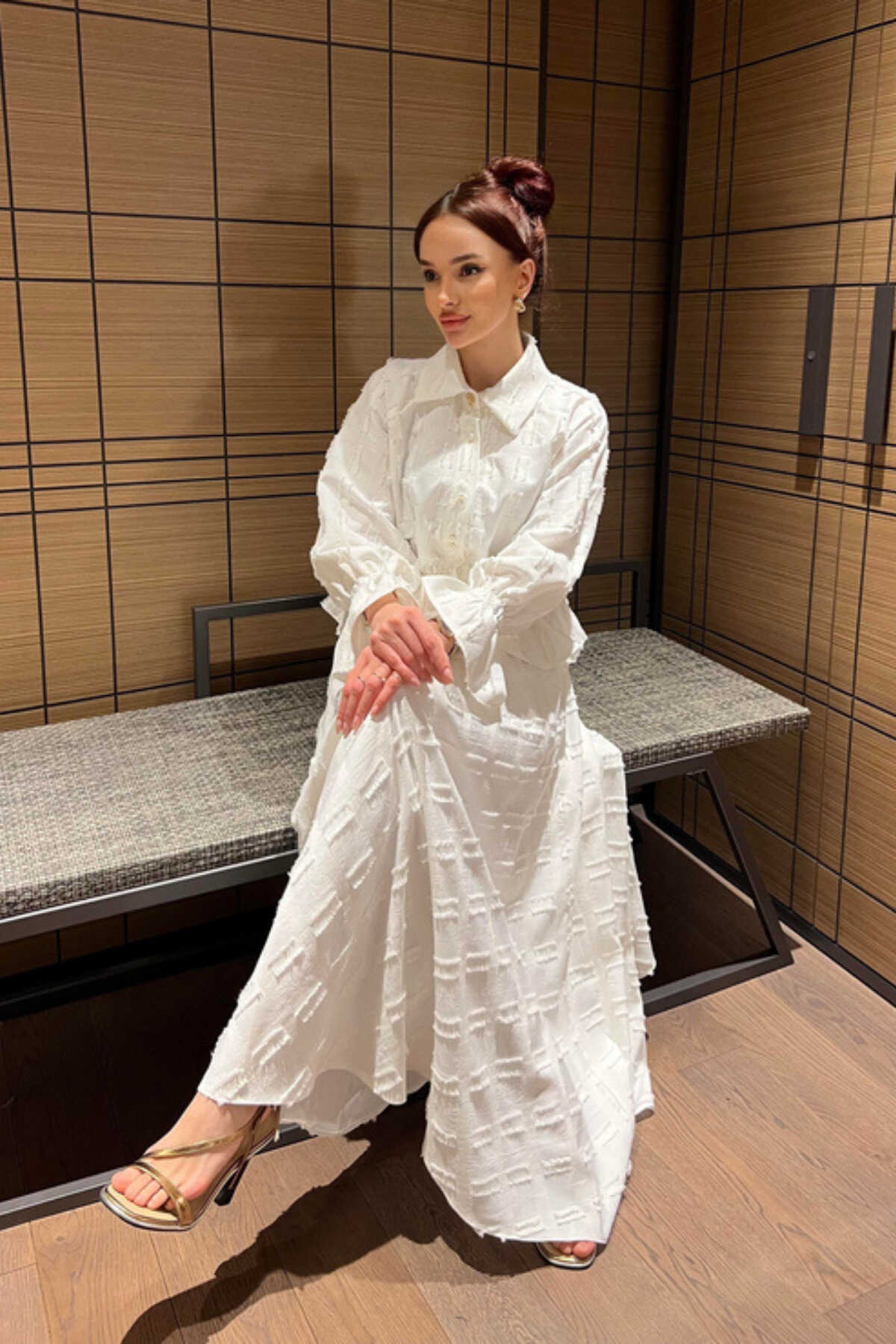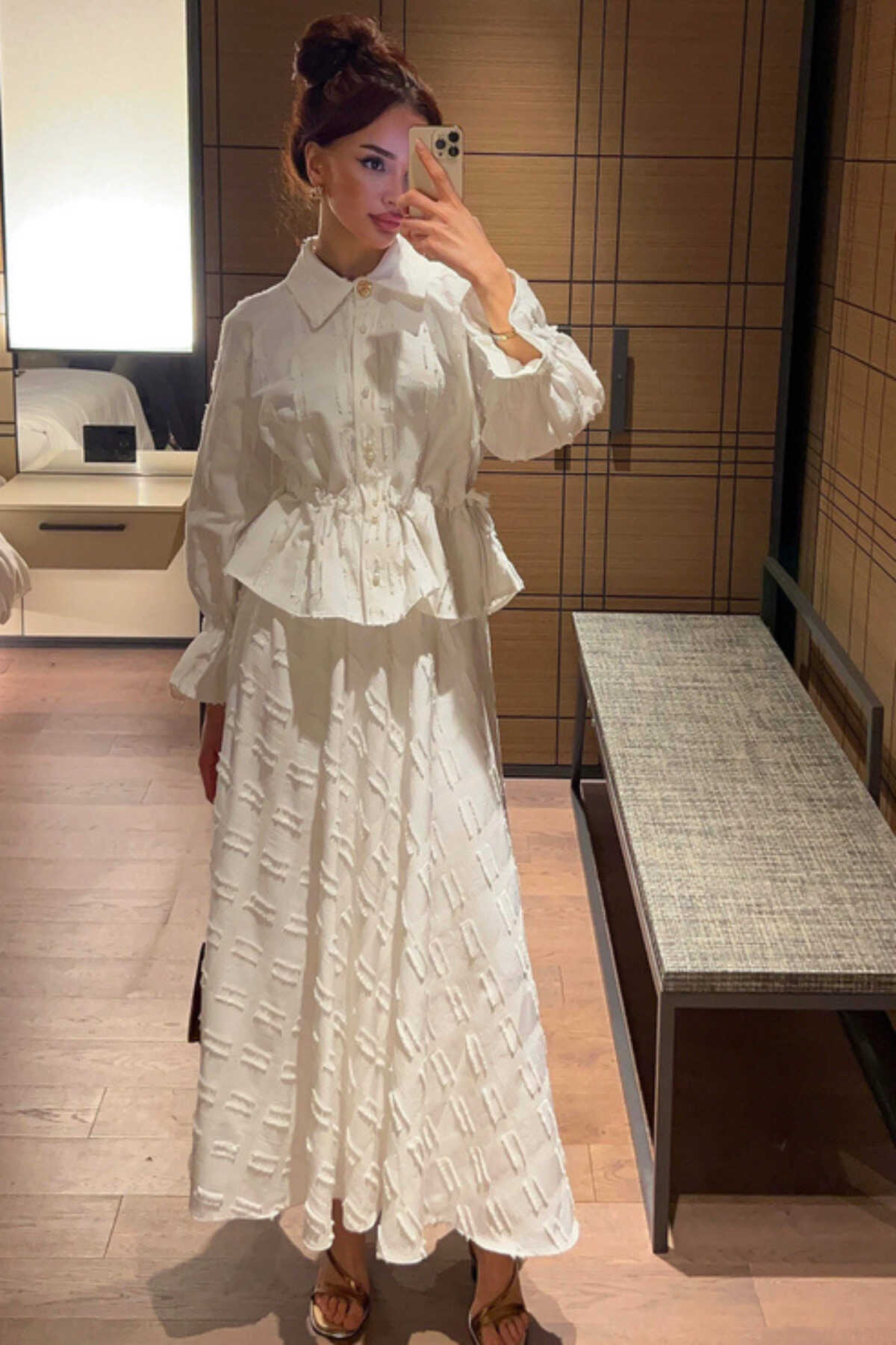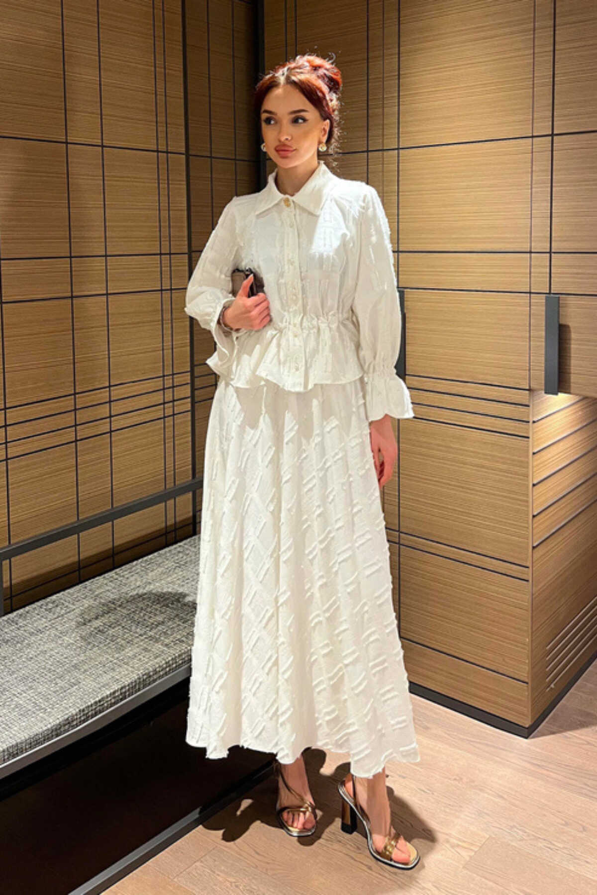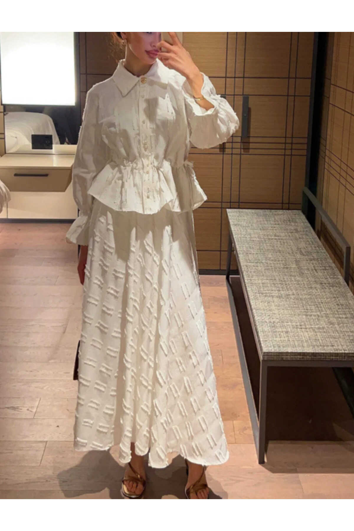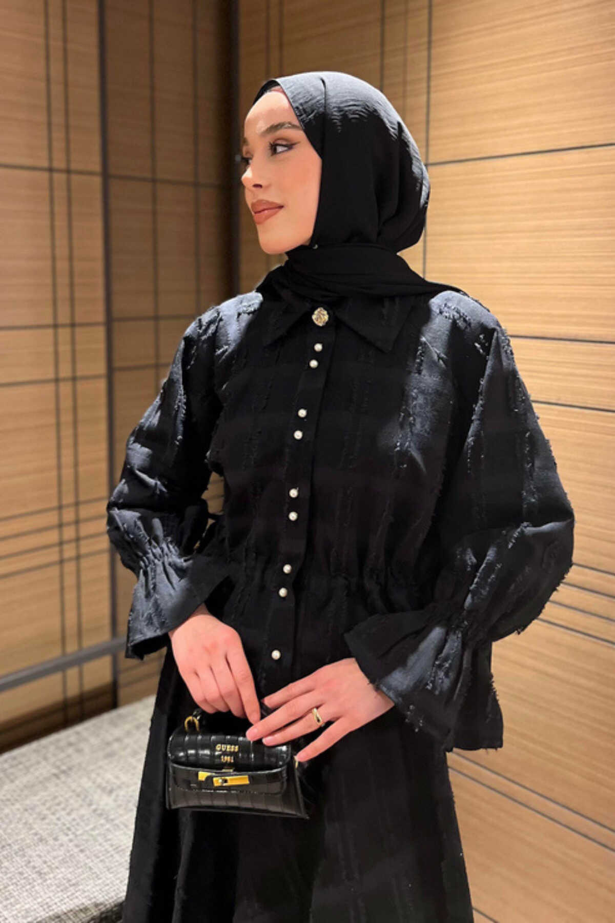 - Klasik ve şık bir görünüm için siyah renkli, düz desenli keten takım.; - Gömlek ve etek olmak üzere iki parçadan oluşan, tesettür giyim koleksiyonuna uygun tasarım.; - Normal bel ve düz paça kesimiyle rahat bir kullanım sunar.; - Standart kol tipi ve gömlek yaka detayları ile zamansız bir stil yaratır.; - İncili düğmeli püsküllü detaylarıyla zarif bir dokunuş katarken, cepsiz tasarımı ile sade bir görünüm sağlar.; - Keten karışımlı dokuma kumaşı sayesinde ince ve hafif yapıya sahip olup, kırışmaya dayanıklıdır.; - Regular kalıp ile vücut hatlarını saran ancak sıkmayan rahat bir oturuşa sahiptir.; - Düğmeli kapama şekli kolay giyilip çıkartılmasını mümkün kılarken uzun kollu tasarım mevsim geçişlerinde idealdir.; - Astarsız yapısıyla hafiflik sunarken, 30 derecede hassas yıkama talimatına uygun şekilde bakımı kolaydır.; - Tüm sezonlar için uygun olan bu takım, gündüzden geceye her ortama uyum sağlar.; - Kemersiz tas