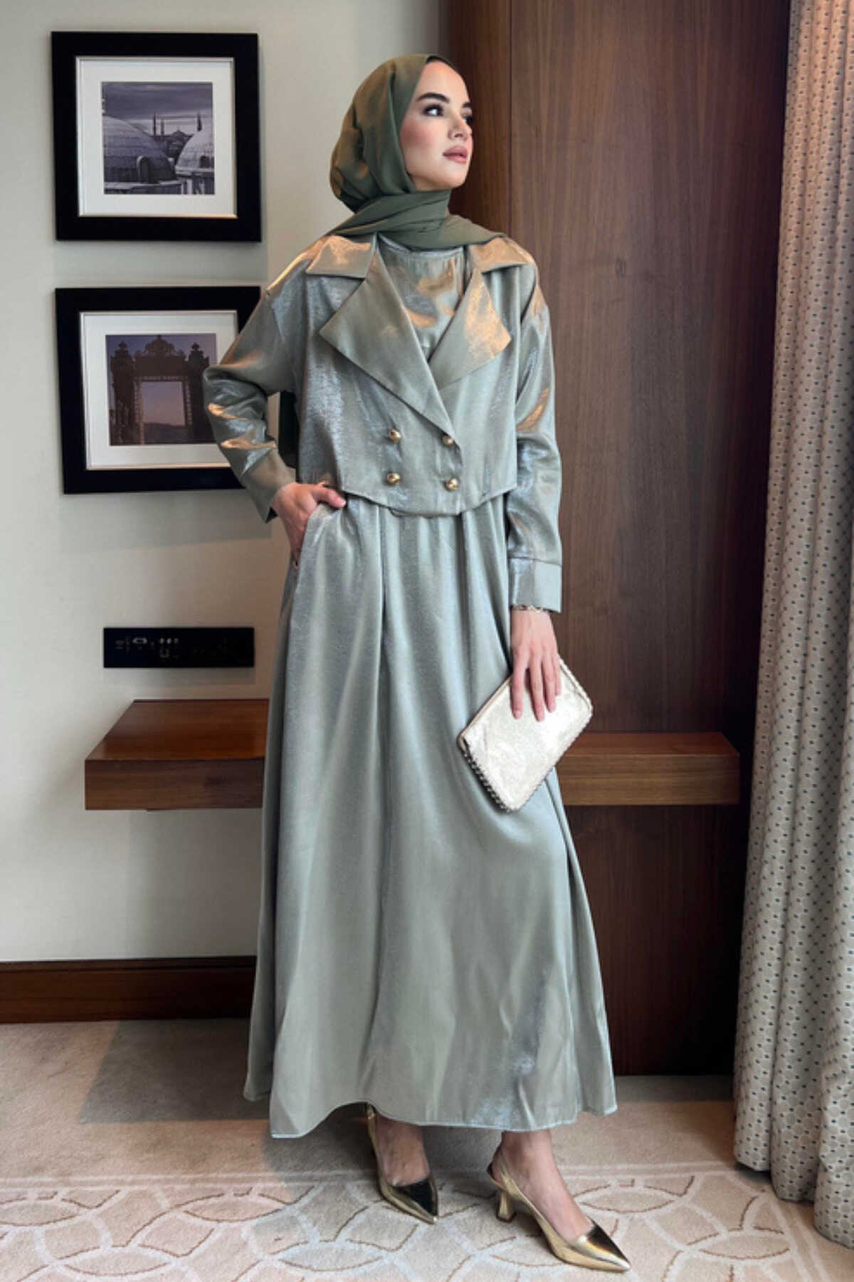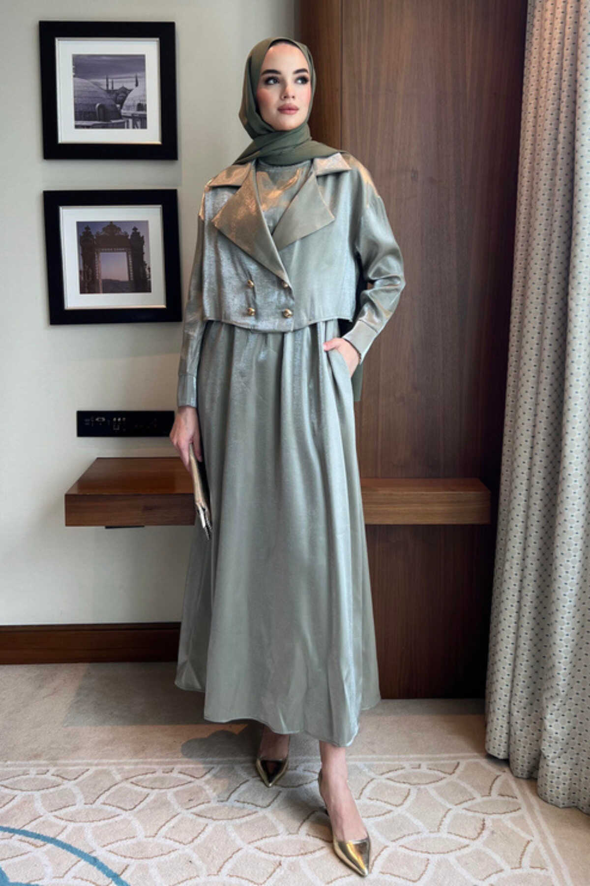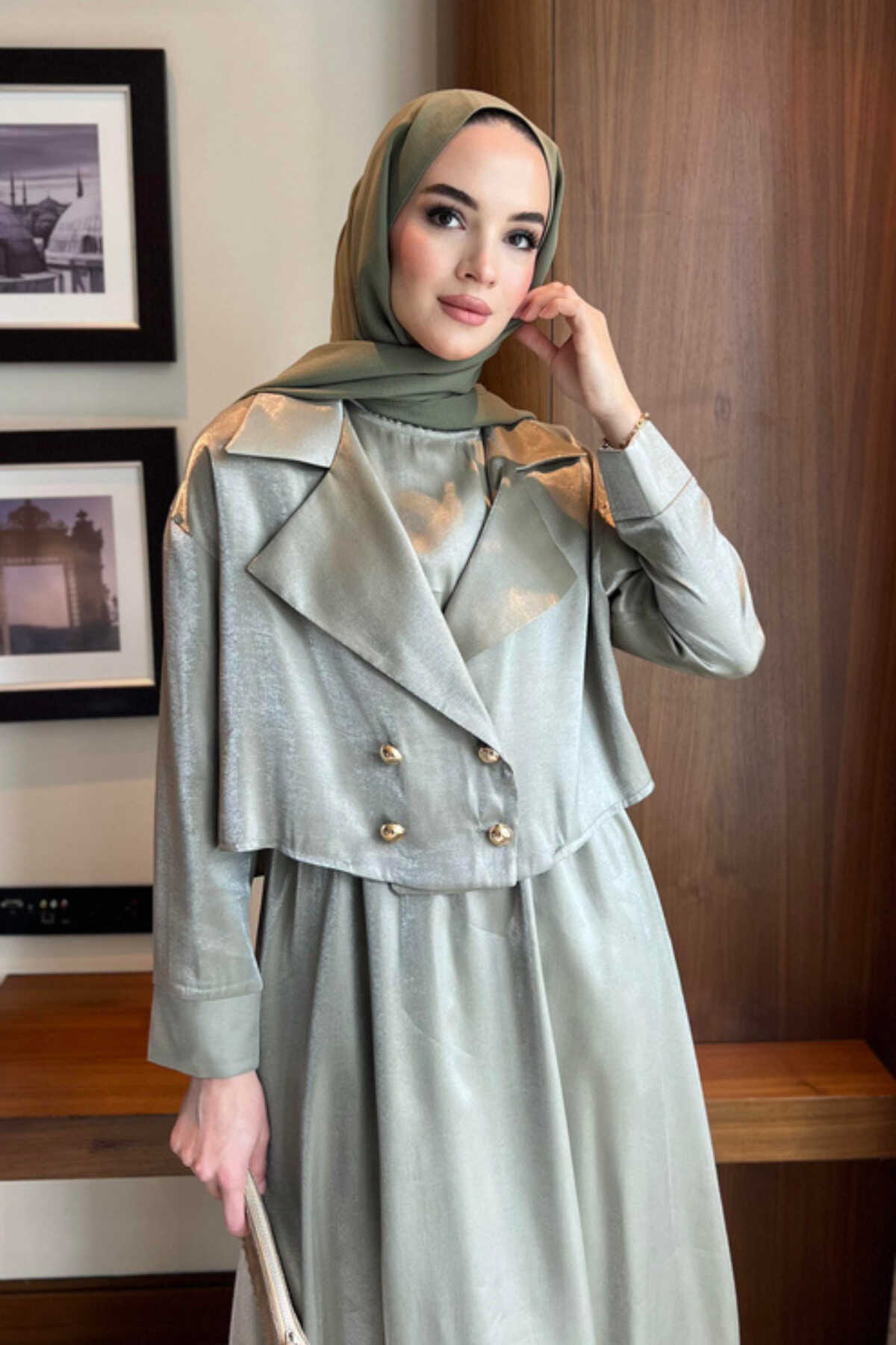 - Zarif tasarımıyla dikkat çeken bu takım, şıklığı ve rahatlığı bir arada sunar.; - Uzun kollu elbise ve düğmeli ceketten oluşan ikili kombin, hem gündüz hem de gece davetlerinde tercih edilebilir.; - Haki rengiyle doğal tonların zarafetini yansıtan bu takım, her mevsime uyum sağlayacak şekilde tasarlanmıştır.; - Pamuk polyester karışımından üretilen kumaşı sayesinde konforlu bir kullanım sunar ve dayanıklılığı artırır.; - Tesettür giyim koleksiyonuna özel olarak tasarlanmış bu takım, modern çizgilerle geleneksel şıklığı harmanlar.; - Jakar panelli detayları ile göz alıcı bir görünüm kazandırırken, düz deseniyle sadeliği ön plana çıkarır.; - Astarsız yapısıyla hafif ve ferah bir kullanım imkanı sunan bu takım, kolay kombinlenebilirliği ile gardırobunuzun vazgeçilmezi olacak.; - 40-42 bedeni sayesinde geniş bir kullanıcı kitlesine hitap ederken, paçasız kesimiyle modern bir siluet oluşturur.; - Uzun kol boyu ile mevsim koşullarına uygun koruma sağlarken, bisiklet yakası rahat hareket etme özgürlüğü tanır.; - 30 derecede hassas yıkama talimatlarına uyarak uzun süre ilk günkü formunu koruyabilirsiniz.