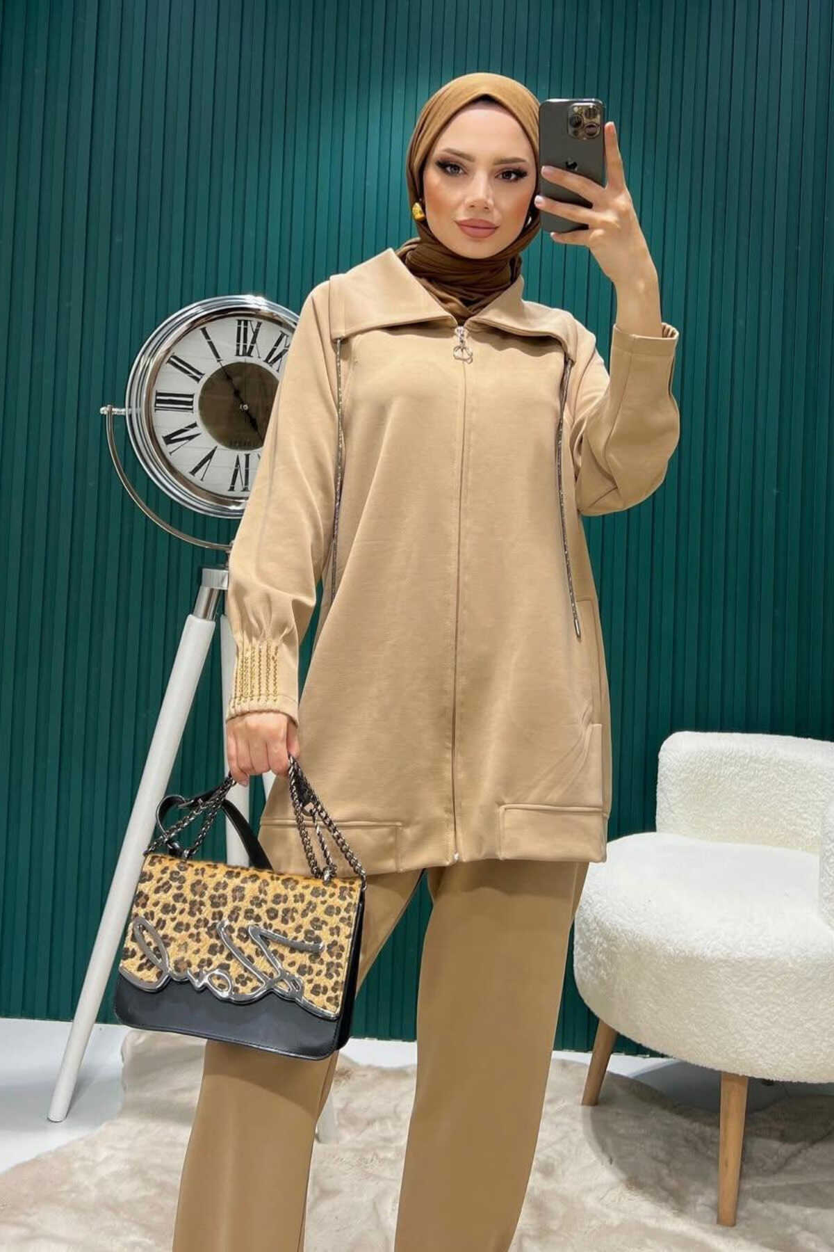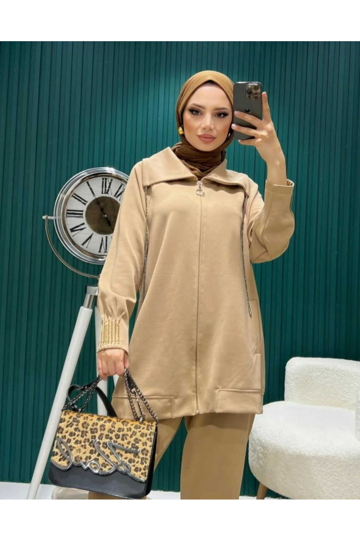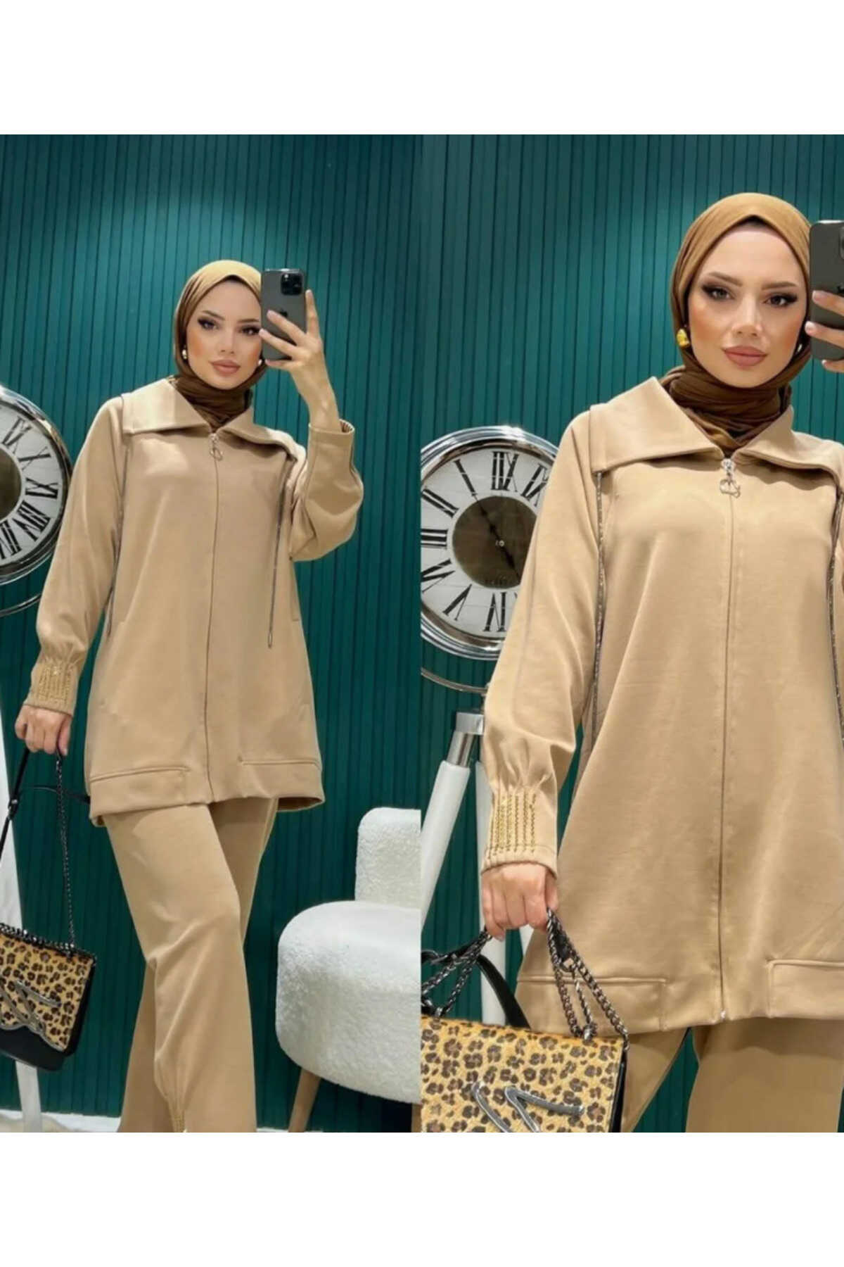- Bej rengiyle şıklığı ve zarafeti bir arada sunan oversize ikili takım, günlük kullanım için idealdir.; - T kol tasarımı ile rahat hareket etme özgürlüğü sağlar ve modern bir görünüm kazandırır.; - Düz kesimi sayesinde her türlü kombinle uyum içinde olur; casual ortamlarda konforlu bir stil oluşturmanızı sağlar.; - Boncuk işlemeli detayları ile göz alıcı bir dokunuş eklerken, kemer veya kuşak ihtiyacını ortadan kaldırarak pratikliği artırır.; - 30°C'de narin yıkama önerisiyle uzun süreli kullanım için dayanıklılık gösterir; düşük ısıda ütüleme imkanıyla bakımı kolaylaştırır.; - Normal bel yüksekliği ve lastikli paça detaylarıyla hem rahatlık hem de şık bir siluet sunar.; - İki parçadan oluşan tunikli pantolonlu set, tesettür giyim tercih edenler için mükemmel bir alternatif oluşturur.; - Mom siluetiyle zamansız bir tarza sahip olan bu takım, her yaş grubuna hitap ederken cool & comfort persona'ya uygunluk gösterir.; - Tesettür giyim koleksiyonuna özel olarak tasarlanmıştır; dokuma materyali kaliteli hissiyat verirken esnek yapısıyla gün boyu konfor sağlar.; - Şal yakası sayesinde farklı hava koşullarına karşı koruma sunarken parıltılı detaylarla dikkat çekici bir görünüm kazandırır.; - Esnek yapısı sayesinde vücut hatlarınıza uyum sağlayarak özgürce hareket etmenizi mümkün kılar.; - Astarsız oluşuyla hafiflik katarken tüm sezonlarda tercih edebileceğiniz çok yönlülüğe sahiptir.