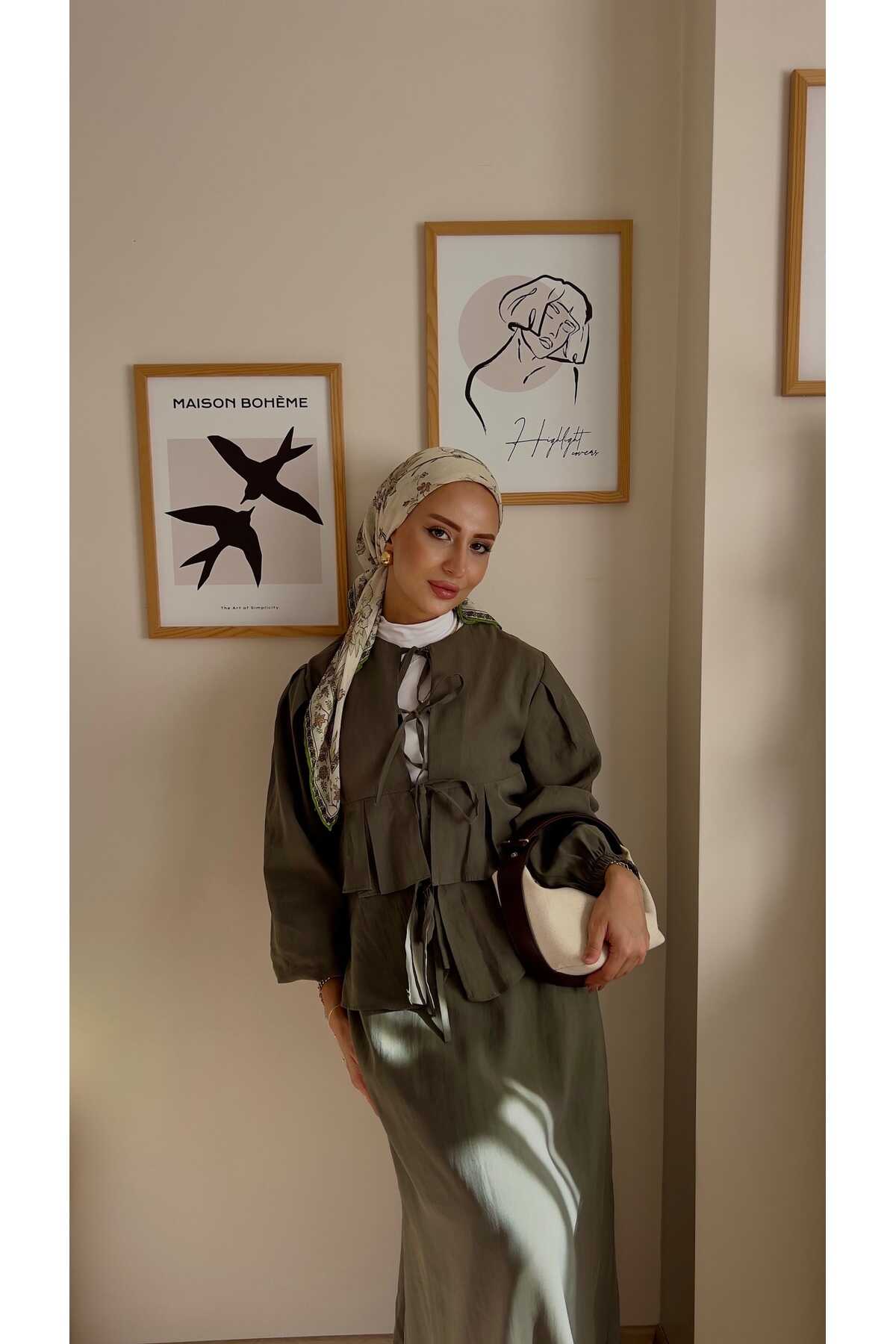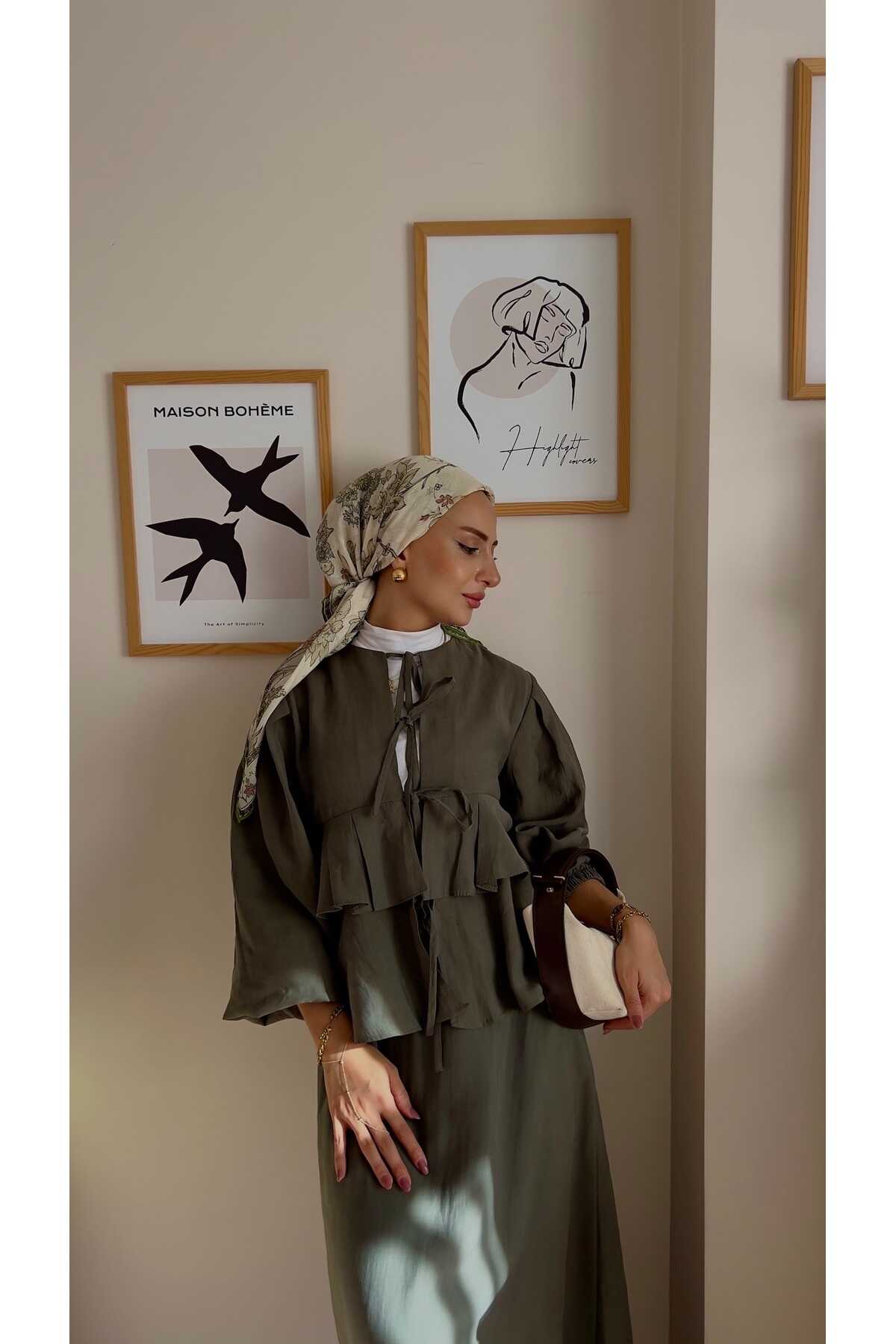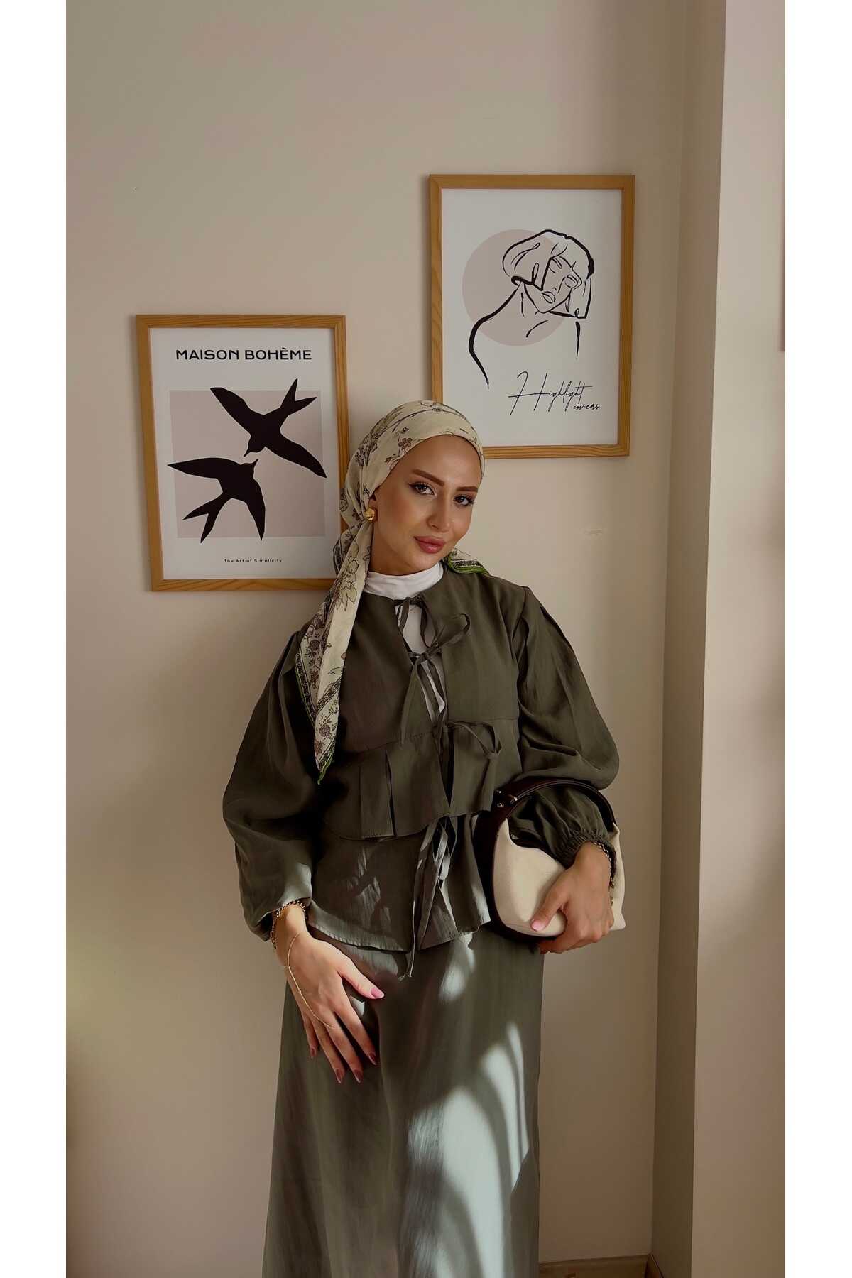 - Zarif haki tonlarında tasarlanmış, yaz aylarının vazgeçilmez şıklığını yansıtan ikili takım.; - Normal boy kesimi ile rahat hareket etme özgürlüğü sunan kloş kalıplı tasarım.; - İnce dokusuyla hafif ve konforlu bir kullanım sağlar; pamuklu materyali sayesinde gün boyu ferahlık hissi verir.; - Paçasız paça tipiyle modern ve şık bir görünüm kazandırırken, pile detayları ile sofistike bir dokunuş ekler.; - Sürdürülebilir üretim anlayışına uygun olarak üretilmiş olup çevre dostu tercihler arasında yer alır.; - Düz deseniyle sadelikten yana olanların beğenisini toplayacak şekilde tasarlanmıştır.; - Bağlama veya bağcık detaylarıyla kolayca ayarlanabilir bel yapısı sayesinde farklı vücut tiplerine uyum sağlar.; - Beli lastikli olması günlük kullanım için pratiklik katarken, astarsız yapısıyla hafifliği ön plana çıkarır.; - Smart koleksiyonuna ait bu takım, hem gündüz hem de gece ortamları için idealdir.; - Balon kol tasarımı ile feminen çizgilere sahip olup, zarifliğinizi ön plana çıkartır.; - Bağlama ya da bağcık gibi kolayca takılıp çıkarılabilen kapama şekilleriyle pratik kullanım imkanı sunar.; - Bel kısmındaki lastik detayları sayesinde vücuda tam oturarak mükemmel bir siluet oluşturur.; - Kemer ya da kuşak ihtiyacını ortadan kaldıran bu takım, minimalist yaklaşımla gardrobunuzu zenginleştirir.; - Web color olarak adlandırılan haki rengiyle doğal tonların asaletini yansıtırken her türden aksesuarla kolayca kombinlenebilir.; - Kadın ve kız kullanıcılar için özel olarak hazırlanmış bu takım, her yaş grubundan kadınların gardırobunda yerini almayı hak eder.; - İpek krep kumaş kullanımıyla lüks hissiyatınıza eşlik edecek üst düzey bir deneyim vaat eder.; - 30 derecede makinede yıkama ya da kuru temizleme seçenekleriyle bakımı kolaydır; böylece uzun süre ilk günkü gibi kalmasını sağlar.; - A-line silueti sayesinde vücut hatlarını nazikçe sararak feminen duruşunuzu pekiştirir.