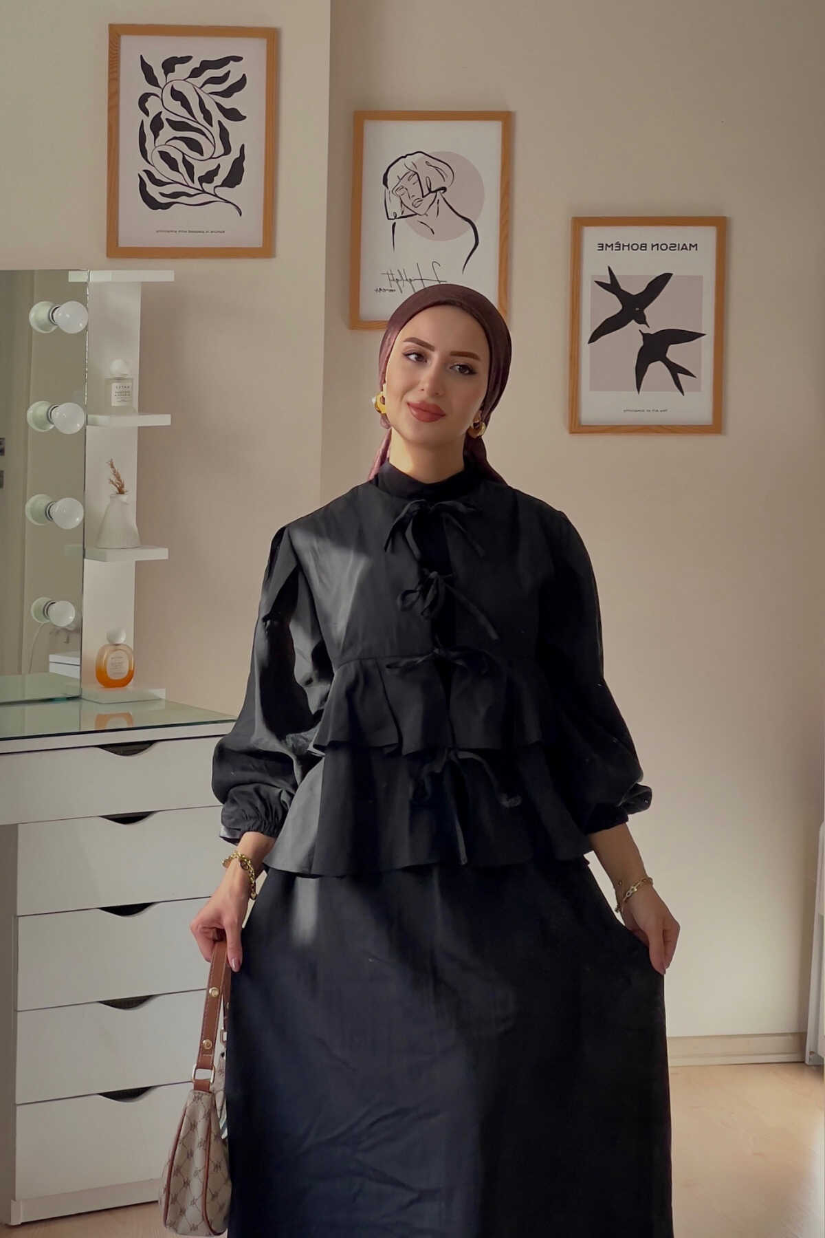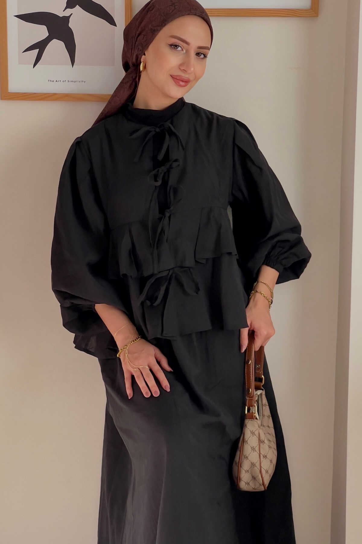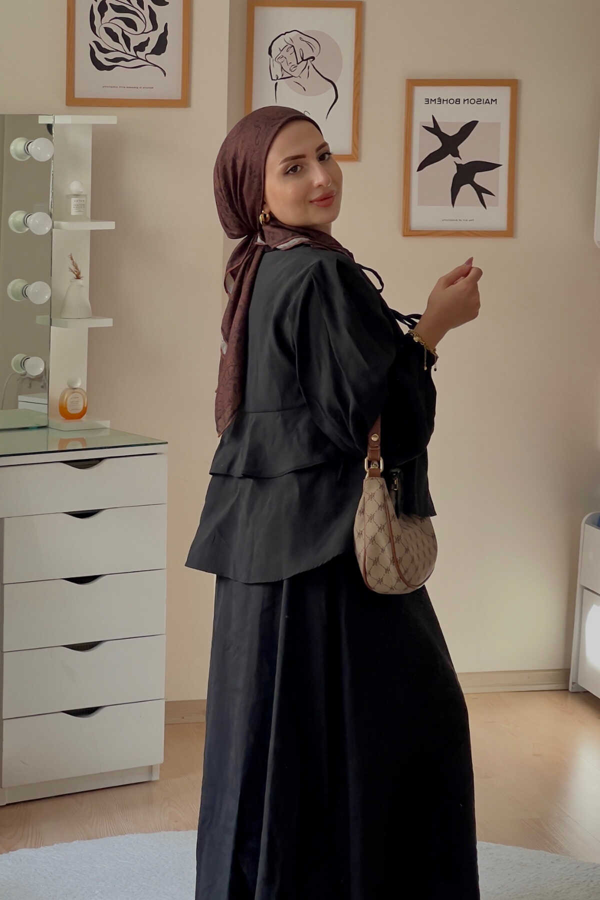 - Zarif haki tonlarında tasarlanmış, yaz aylarının vazgeçilmez şıklığını yansıtan ikili takım.; - Normal boy kesimi ile rahat hareket etme özgürlüğü sunan kloş kalıplı tasarım.; - İnce dokusuyla hafif ve konforlu bir kullanım sağlar; pamuklu materyali sayesinde gün boyu ferahlık hissi verir.; - Paçasız paça tipiyle modern ve şık bir görünüm kazandırırken, pile detayları ile sofistike bir dokunuş ekler.; - Sürdürülebilir üretim anlayışına uygun olarak üretilmiş olup çevre dostu tercihler arasında yer alır.; - Düz deseniyle sadelikten yana olanların beğenisini toplayacak şekilde tasarlanmıştır.; - Bağlama veya bağcık detaylarıyla kolayca ayarlanabilir bel yapısı sayesinde farklı vücut tiplerine uyum sağlar.; - Beli lastikli olması günlük kullanım için pratiklik katarken, astarsız yapısıyla hafifliği ön plana çıkarır.; - Smart koleksiyonuna ait bu takım, hem gündüz hem de gece ortamları için idealdir.; - Balon kol tasarımı ile feminen çizgilere sahip olup, zarifliğinizi ön plana çıkartır.; - Bağlama ya da bağcık gibi kolayca takılıp çıkarılabilen kapama şekilleriyle pratik kullanım imkanı sunar.; - Bel kısmındaki lastik detayları sayesinde vücuda tam oturarak mükemmel bir siluet oluşturur.; - Kemer ya da kuşak ihtiyacını ortadan kaldıran bu takım, minimalist yaklaşımla gardrobunuzu zenginleştirir.; - Web color olarak adlandırılan haki rengiyle doğal tonların asaletini yansıtırken her türden aksesuarla kolayca kombinlenebilir.; - Kadın ve kız kullanıcılar için özel olarak hazırlanmış bu takım, her yaş grubundan kadınların gardırobunda yerini almayı hak eder.; - İpek krep kumaş kullanımıyla lüks hissiyatınıza eşlik edecek üst düzey bir deneyim vaat eder.; - 30 derecede makinede yıkama ya da kuru temizleme seçenekleriyle bakımı kolaydır; böylece uzun süre ilk günkü gibi kalmasını sağlar.; - A-line silueti sayesinde vücut hatlarını nazikçe sararak feminen duruşunuzu pekiştirir.