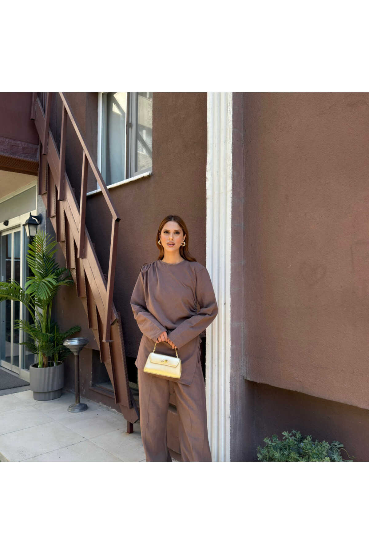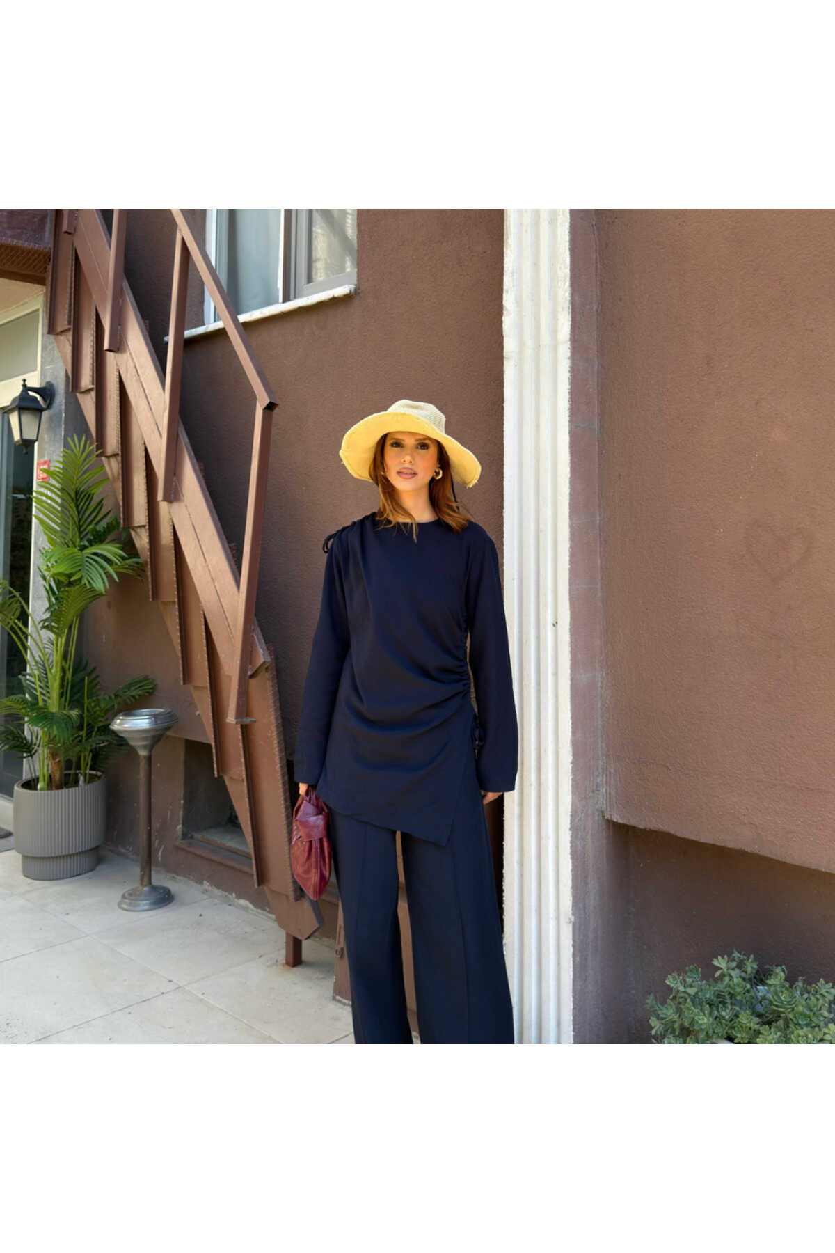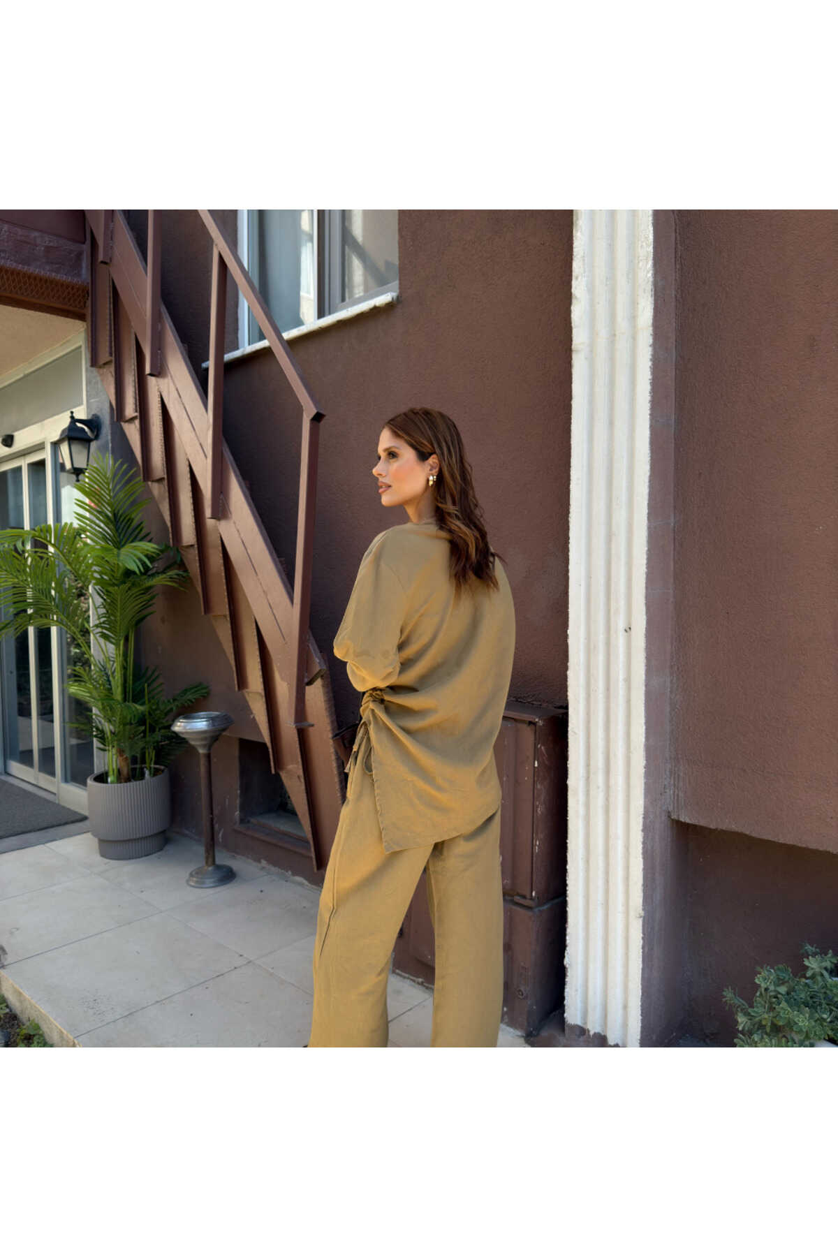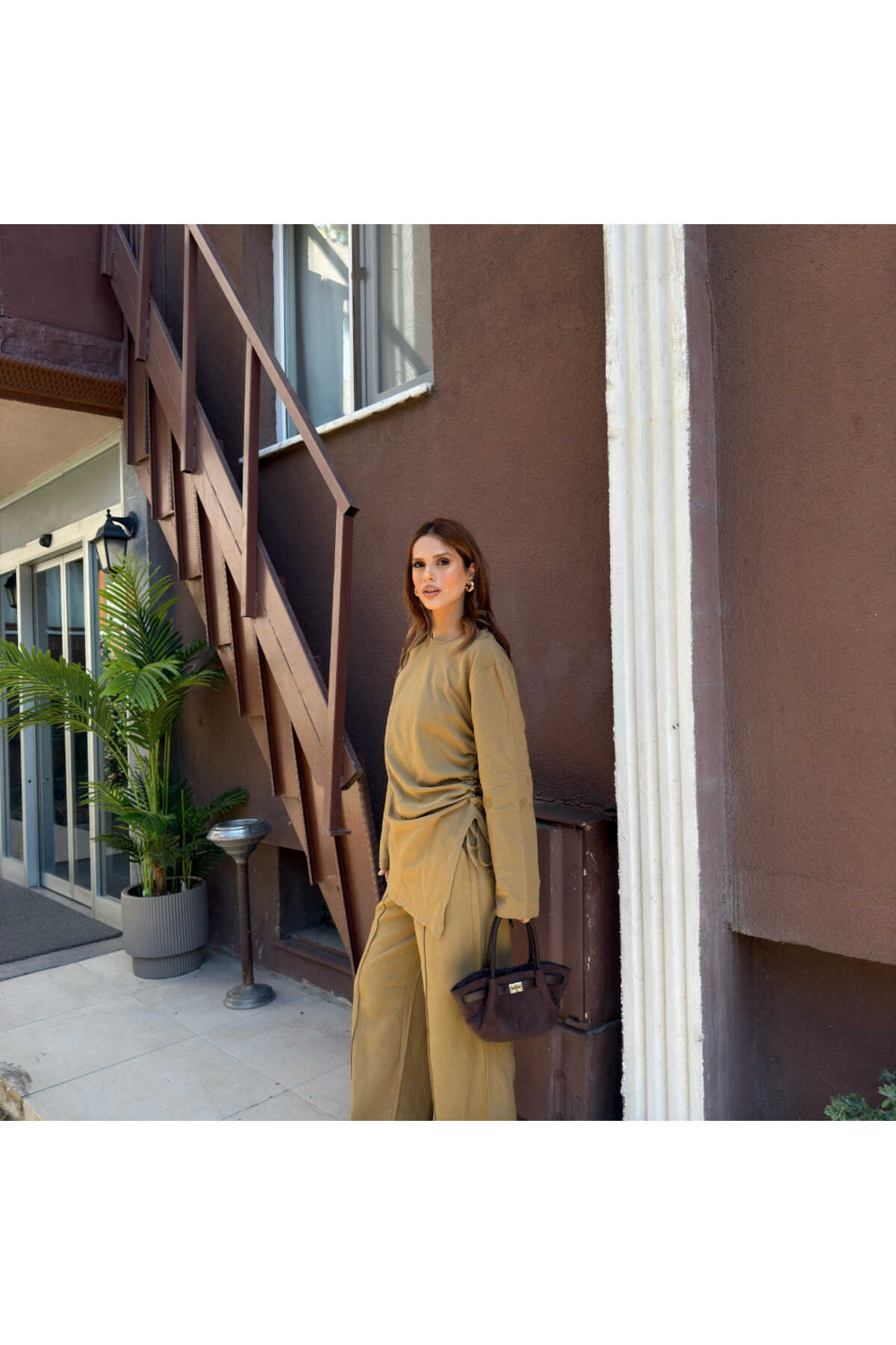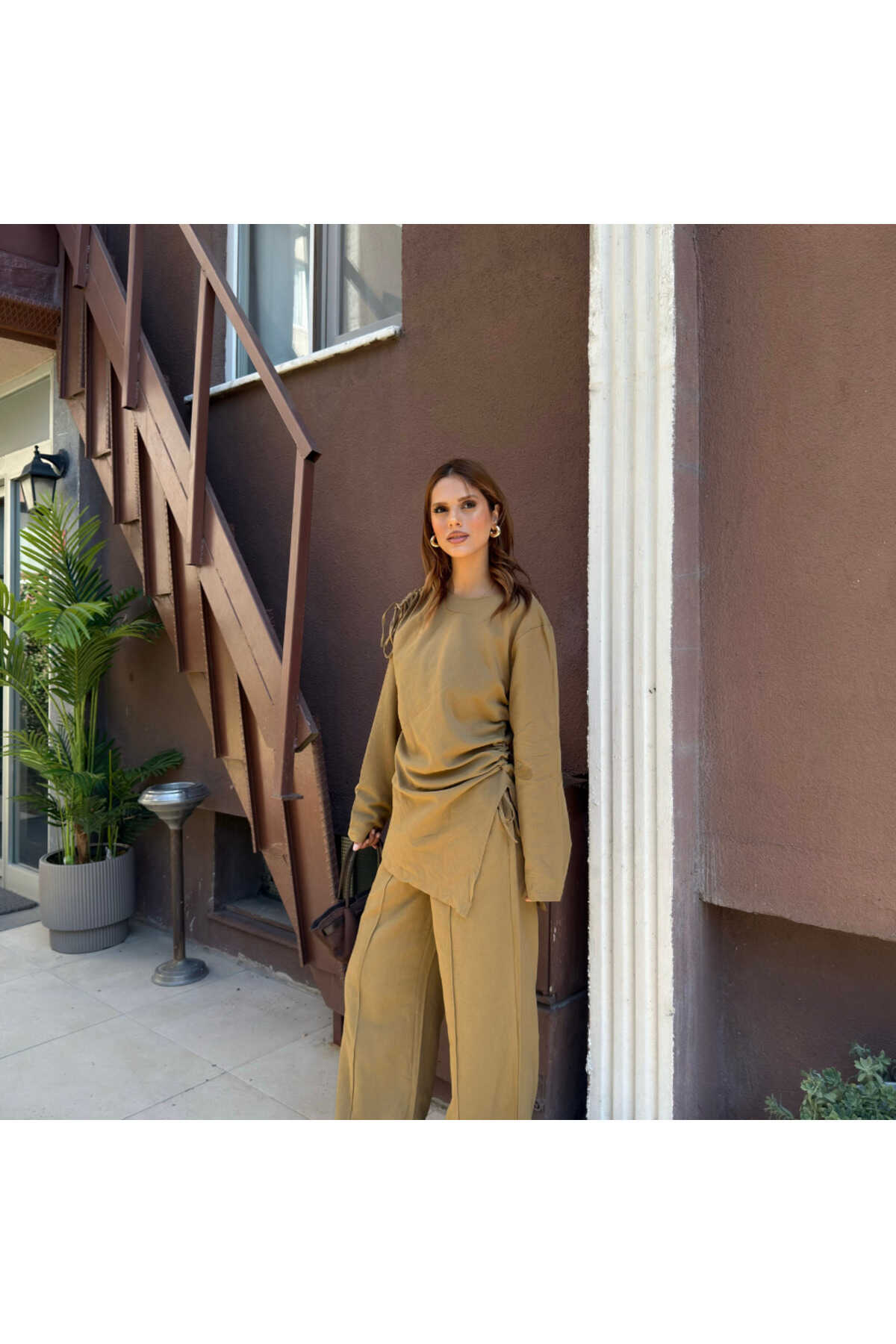 - Haki rengiyle şıklığı ve doğallığı bir arada sunan salaş takım, gündüzden geceye rahatlıkla tercih edilebilir.; - Normal bel kesimi ve bol paça tasarımı ile gün boyu konfor sağlar.; - Standart kol tipi ve fermuarlı kapama şekli, pratik kullanım sunar.; - Yetişkin yaş grubuna hitap eden bu takım, tesettür giyim koleksiyonunun zarif bir parçasıdır.; - Uzun boyu ve ince yapısı ile yaz aylarında serinlik hissi verir.; - Dokuma kumaş tipi, dayanıklılığı ve nefes alabilirliği ile öne çıkar.; - Tunikli pantolonlu alt-üst takım olarak tasarlanmıştır; hem şıklığı hem de rahatlığı bir arada sunar.; - A-line silueti sayesinde vücut hatlarını nazikçe sararak feminen bir görünüm kazandırır.; - Düz deseniyle sade ve zamansız bir stil yaratır.; - Keten karışımlı dokuma tipi, hafifliği ve doğal dokusuyla dikkat çeker.; - Uzun kollu tasarımı ile mevsim geçişlerinde ideal koruma sağlar.; - KETEN DOKUMA materyal bileşeni, dayanıklılığı arttırarak uzun süreli kullanım vaat eder.; - Astarsız yapısı sayesinde hafif