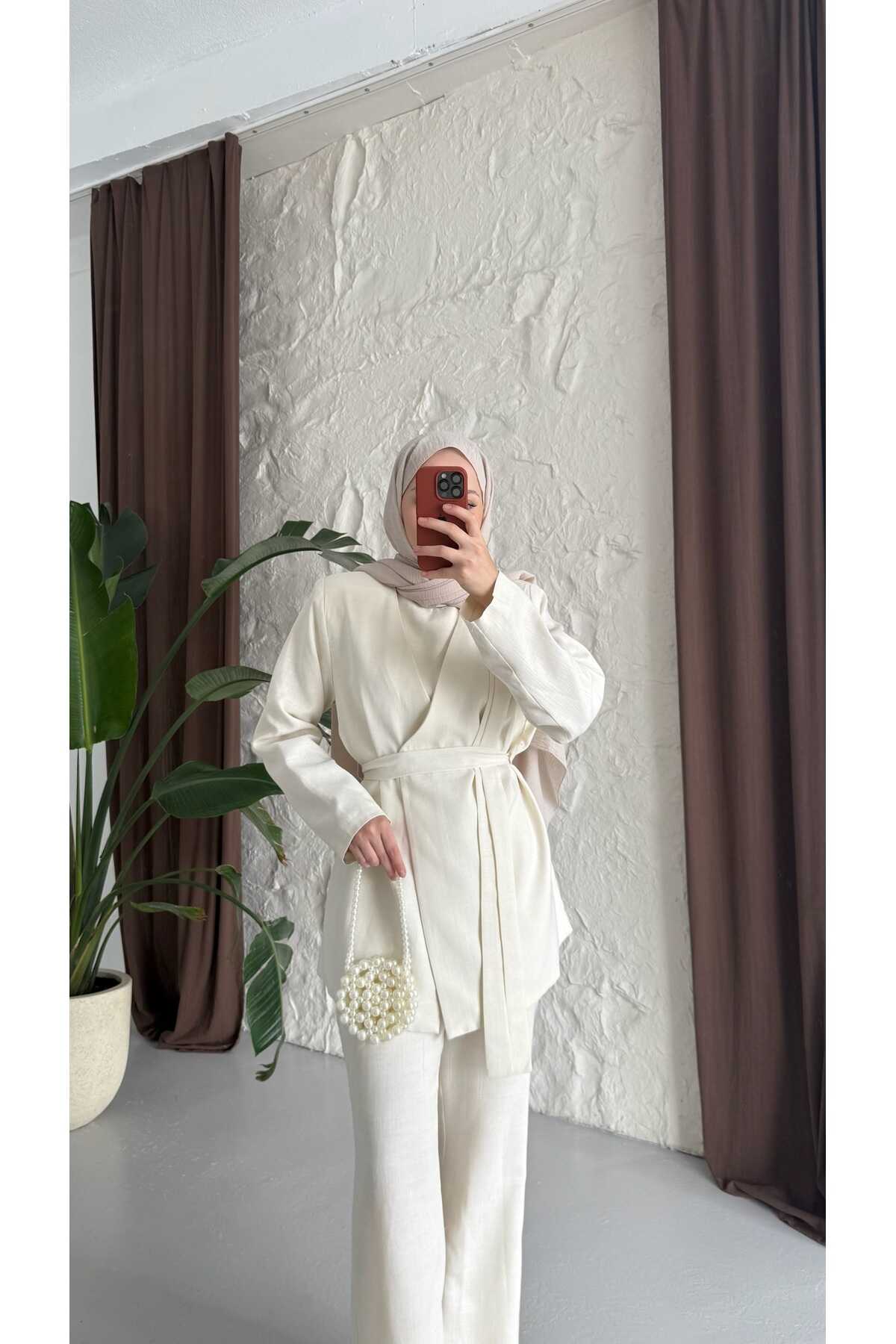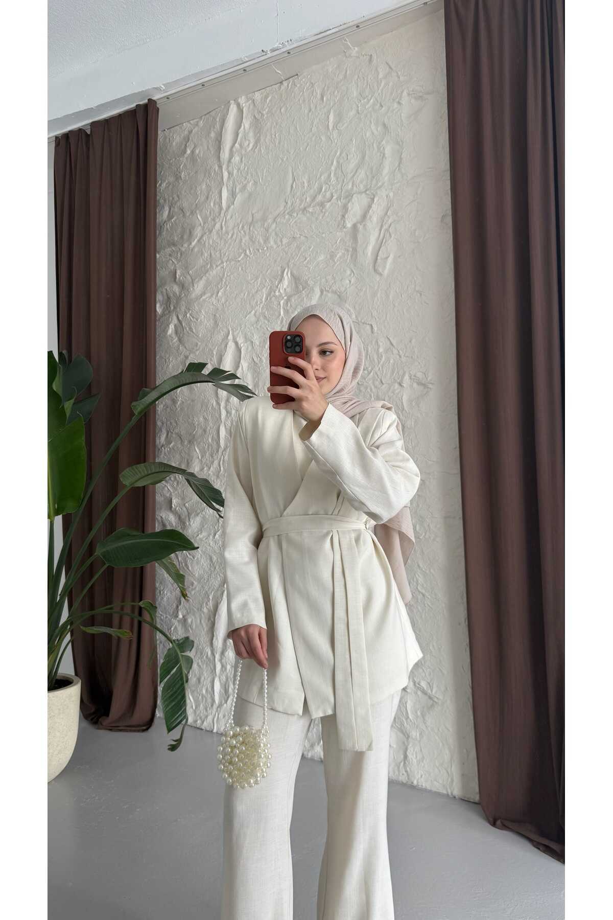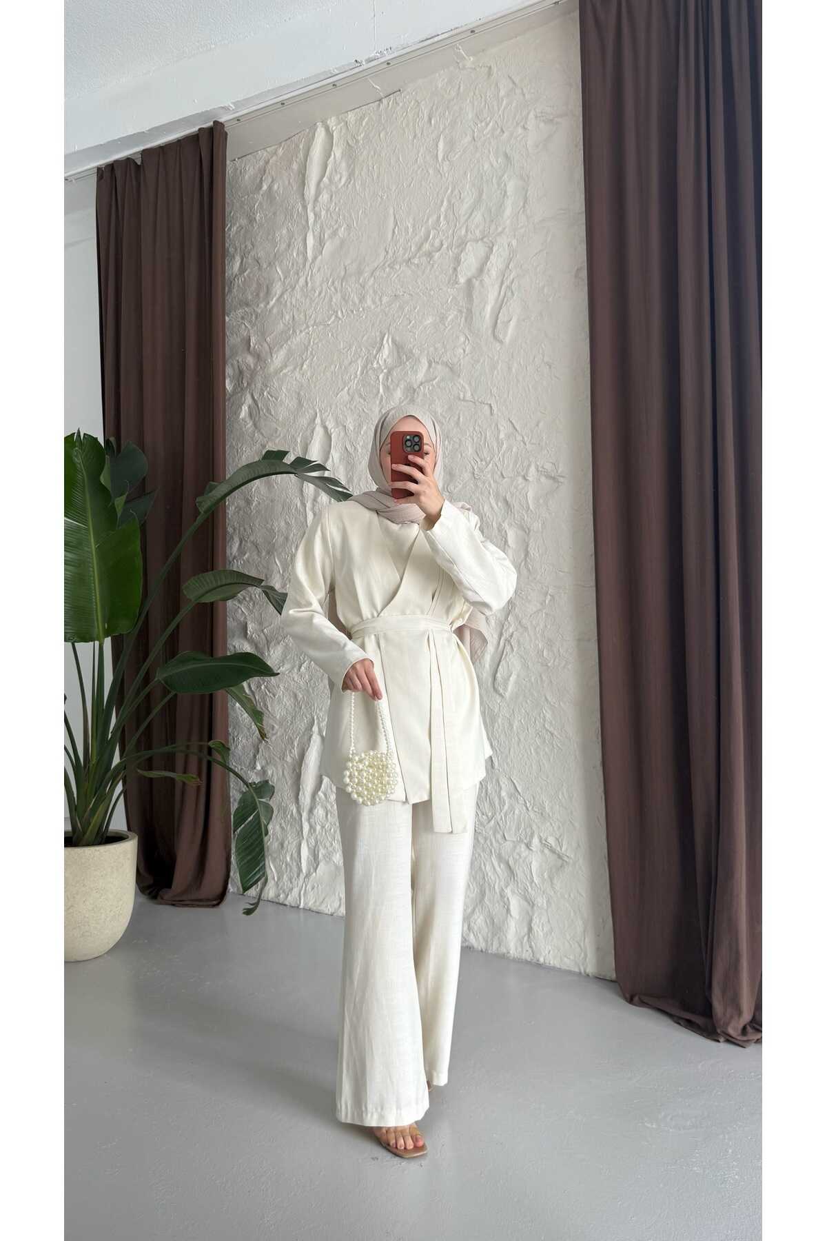 - Klasik ve şık tasarımıyla dikkat çeken kuşaklı keten takım, her ortamda rahatlıkla tercih edilebilir.; - Yüksek kaliteli keten materyali sayesinde yaz aylarında serinlik ve konfor sunar.; - Pratik kullanım için ekstra kemer detayı ile kolayca ayarlama imkanı sağlar.; - Günlük veya özel günlerde rahatlıkla kombinlenebilen bu takım, smart casual tarzınıza uyum sağlar.; - Sürdürülebilirlik ilkesine önem verenler için ideal; çevre dostu malzemelerden üretilmiştir.; - Düz deseniyle zamansız bir görünüm sunarken, her türlü aksesuarla kolayca uyum sağlar.; - İki parçadan oluşan set halinde gelmesi, gardırobunuza pratik bir çözüm getirir.; - Astarlı yapısı sayesinde iç göstermez ve ekstra koruma sunar.; - 30 derecede hassas yıkama talimatına uygun şekilde temizlenebilir; böylece uzun süre ilk günkü gibi kalır.; - Ceket yakası ile sofistike bir hava katarken, çıkabilir yaka özelliğiyle farklı stiller deneme olanağı tanır.; - Düğmeli kapama şekliyle hem modern hem de geleneksel giyim anlayışına hitap eder.; - Beli lastikli silueti sayesinde vücut hatlarınıza mükemmel uyum sağlar ve hareket özgürlüğü verir.; - Normal bel kesimi ile gün boyu rahat etmenizi garanti ederken, paçasız tasarım basit ama şık bir görünüm kazandırır.; - Tesettür giyim koleksiyonuna özel olarak tasarlanmıştır; tesettür modasının zarafetini yansıtır.; - Uzun boyu ile bacakları olduğundan daha uzun gösterirken ince dokusuyla hafifliği hissettirir.; - Gündüzden geceye geçişte ideal olan bu takım, çok yönlülüğüyle gardırobunuzun vazgeçilmezi olmaya adaydır.; - Keten karışımlı kumaşı sayesinde nefes alabilen yapıya sahip olup cildinizle dosttur.; - Uzun kollu tasarım soğuk akşamlarda ekstra koruma sağlarken standart kol tipiyle günlük aktivitelerinizde konforlu hissetmenize yardımcı olur.