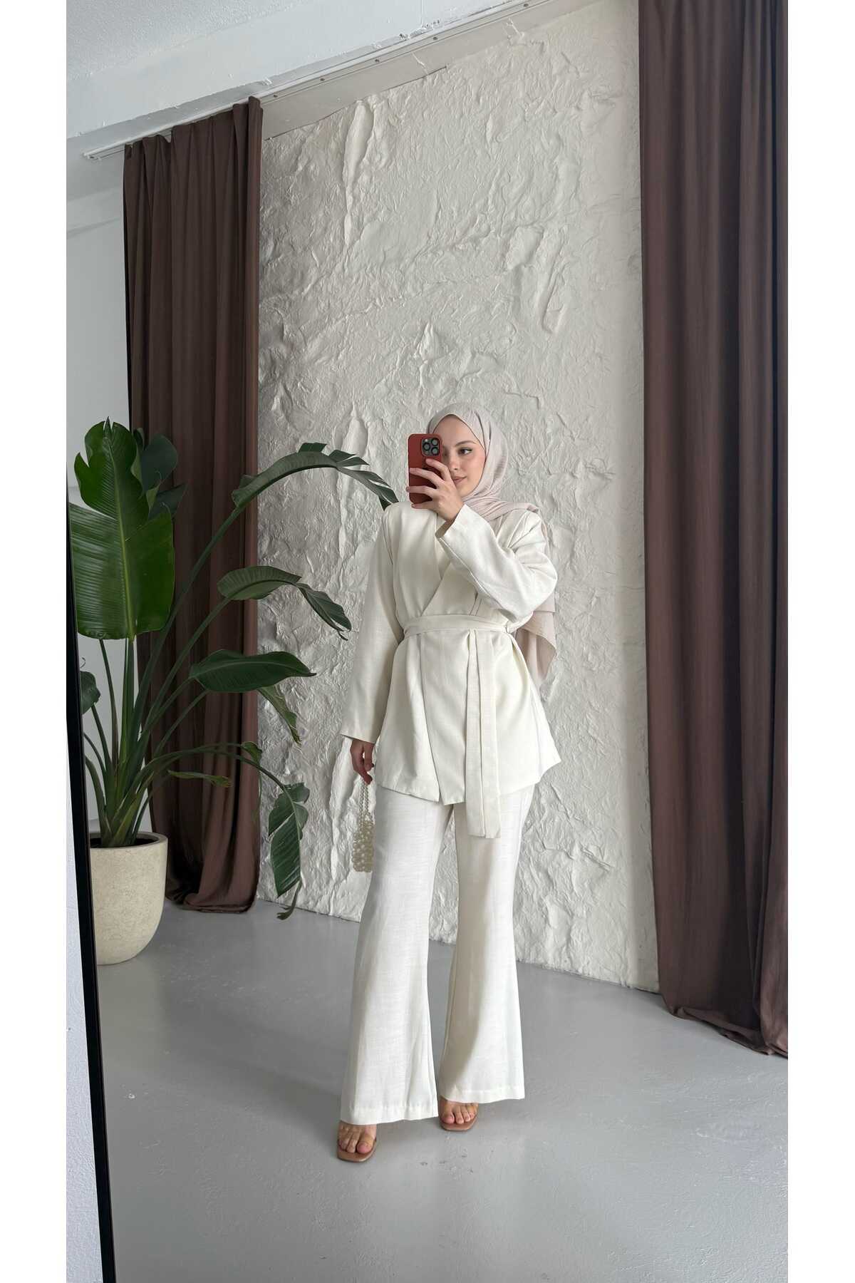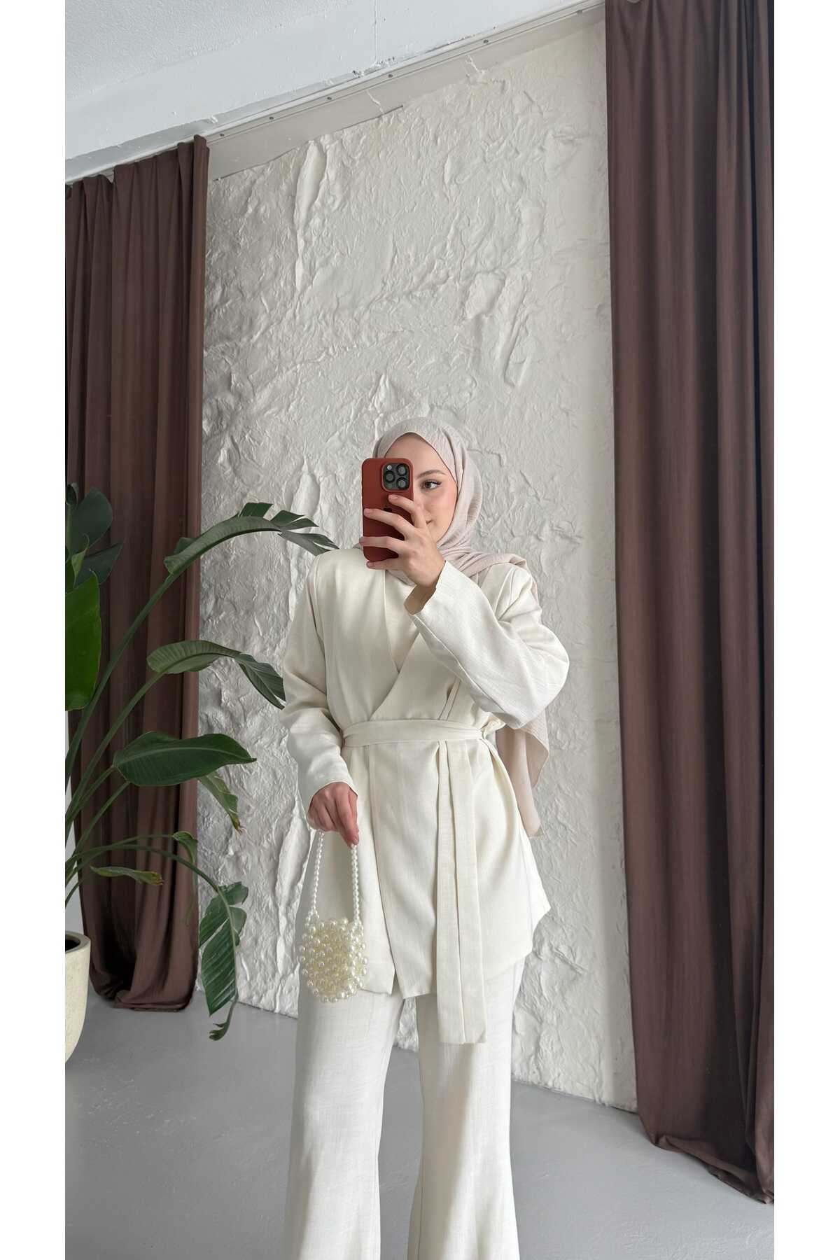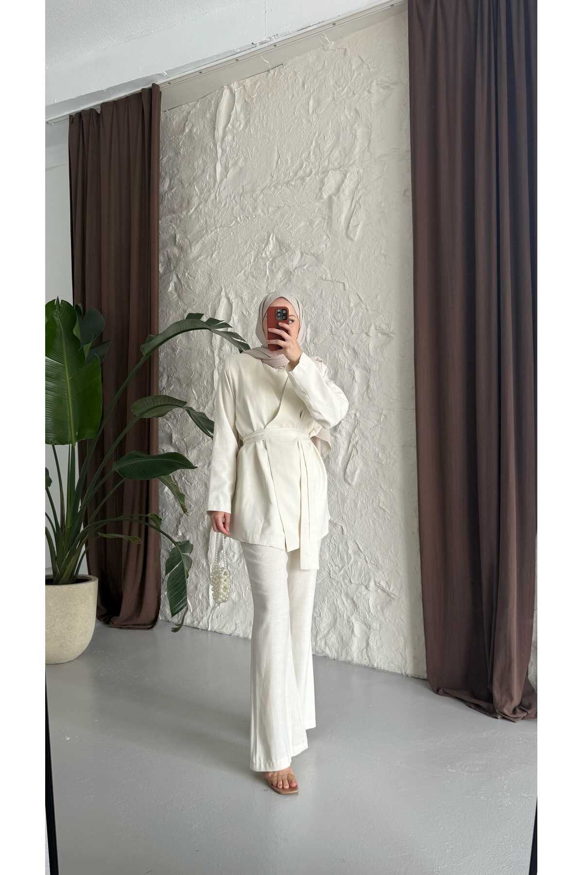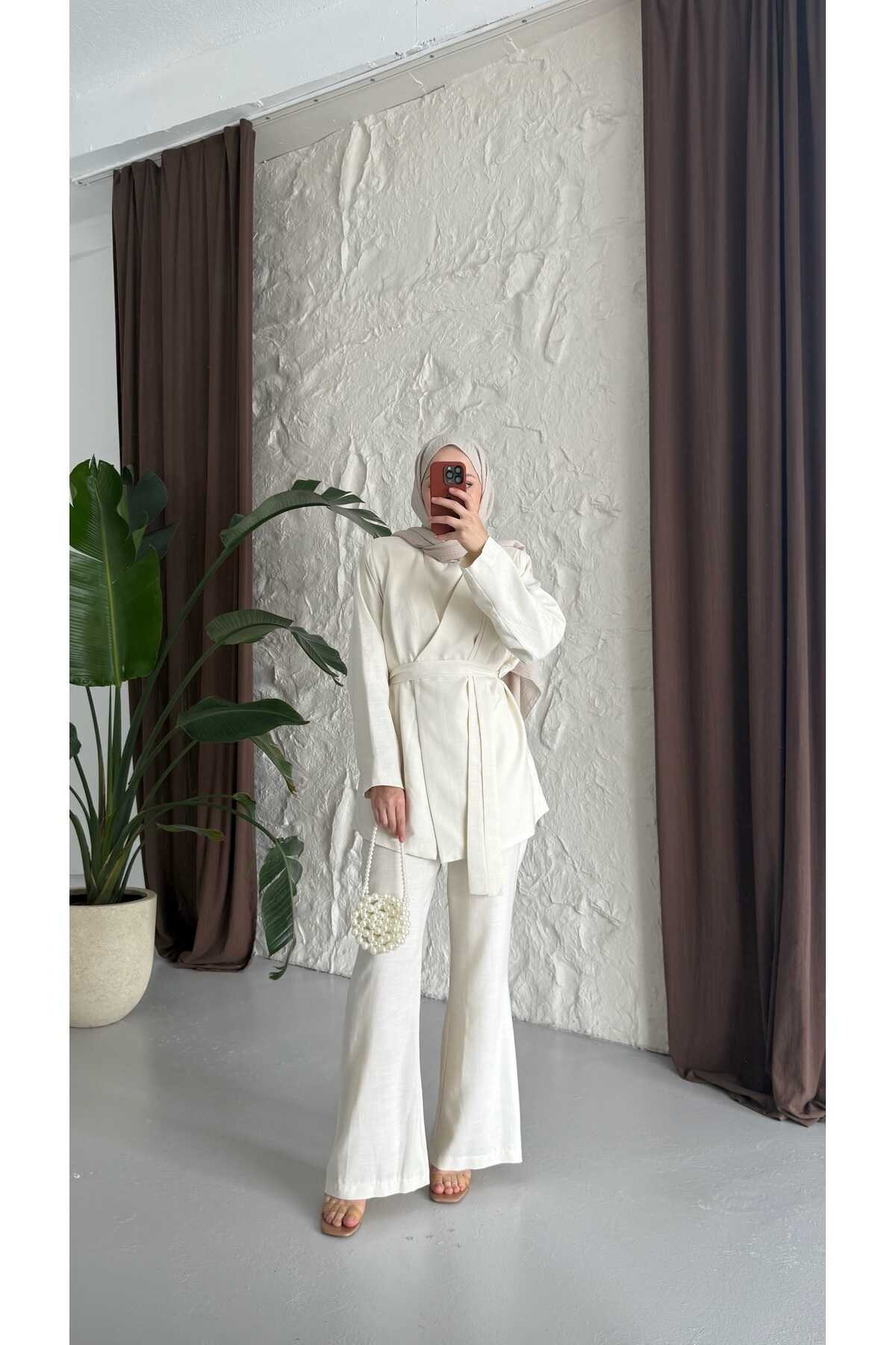 - Klasik ve şık tasarımıyla dikkat çeken kuşaklı keten takım, her ortamda rahatlıkla tercih edilebilir.; - Yüksek kaliteli keten materyali sayesinde yaz aylarında serinlik ve konfor sunar.; - Pratik kullanım için ekstra kemer detayı ile kolayca ayarlama imkanı sağlar.; - Günlük veya özel günlerde rahatlıkla kombinlenebilen bu takım, smart casual tarzınıza uyum sağlar.; - Sürdürülebilirlik ilkesine önem verenler için ideal; çevre dostu malzemelerden üretilmiştir.; - Düz deseniyle zamansız bir görünüm sunarken, her türlü aksesuarla kolayca uyum sağlar.; - İki parçadan oluşan set halinde gelmesi, gardırobunuza pratik bir çözüm getirir.; - Astarlı yapısı sayesinde iç göstermez ve ekstra koruma sunar.; - 30 derecede hassas yıkama talimatına uygun şekilde temizlenebilir; böylece uzun süre ilk günkü gibi kalır.; - Ceket yakası ile sofistike bir hava katarken, çıkabilir yaka özelliğiyle farklı stiller deneme olanağı tanır.; - Düğmeli kapama şekliyle hem modern hem de geleneksel giyim anlayışına hitap eder.; - Beli lastikli silueti sayesinde vücut hatlarınıza mükemmel uyum sağlar ve hareket özgürlüğü verir.; - Normal bel kesimi ile gün boyu rahat etmenizi garanti ederken, paçasız tasarım basit ama şık bir görünüm kazandırır.; - Tesettür giyim koleksiyonuna özel olarak tasarlanmıştır; tesettür modasının zarafetini yansıtır.; - Uzun boyu ile bacakları olduğundan daha uzun gösterirken ince dokusuyla hafifliği hissettirir.; - Gündüzden geceye geçişte ideal olan bu takım, çok yönlülüğüyle gardırobunuzun vazgeçilmezi olmaya adaydır.; - Keten karışımlı kumaşı sayesinde nefes alabilen yapıya sahip olup cildinizle dosttur.; - Uzun kollu tasarım soğuk akşamlarda ekstra koruma sağlarken standart kol tipiyle günlük aktivitelerinizde konforlu hissetmenize yardımcı olur.