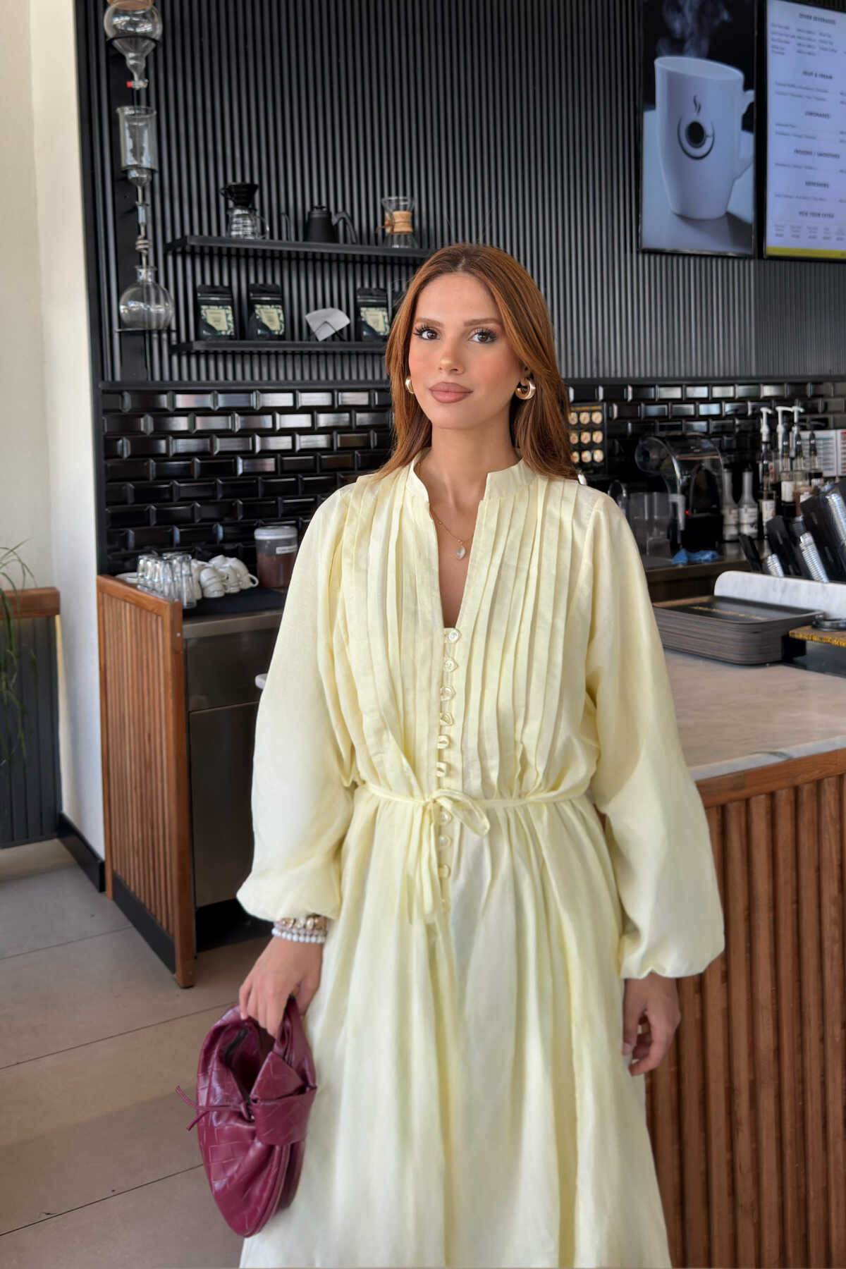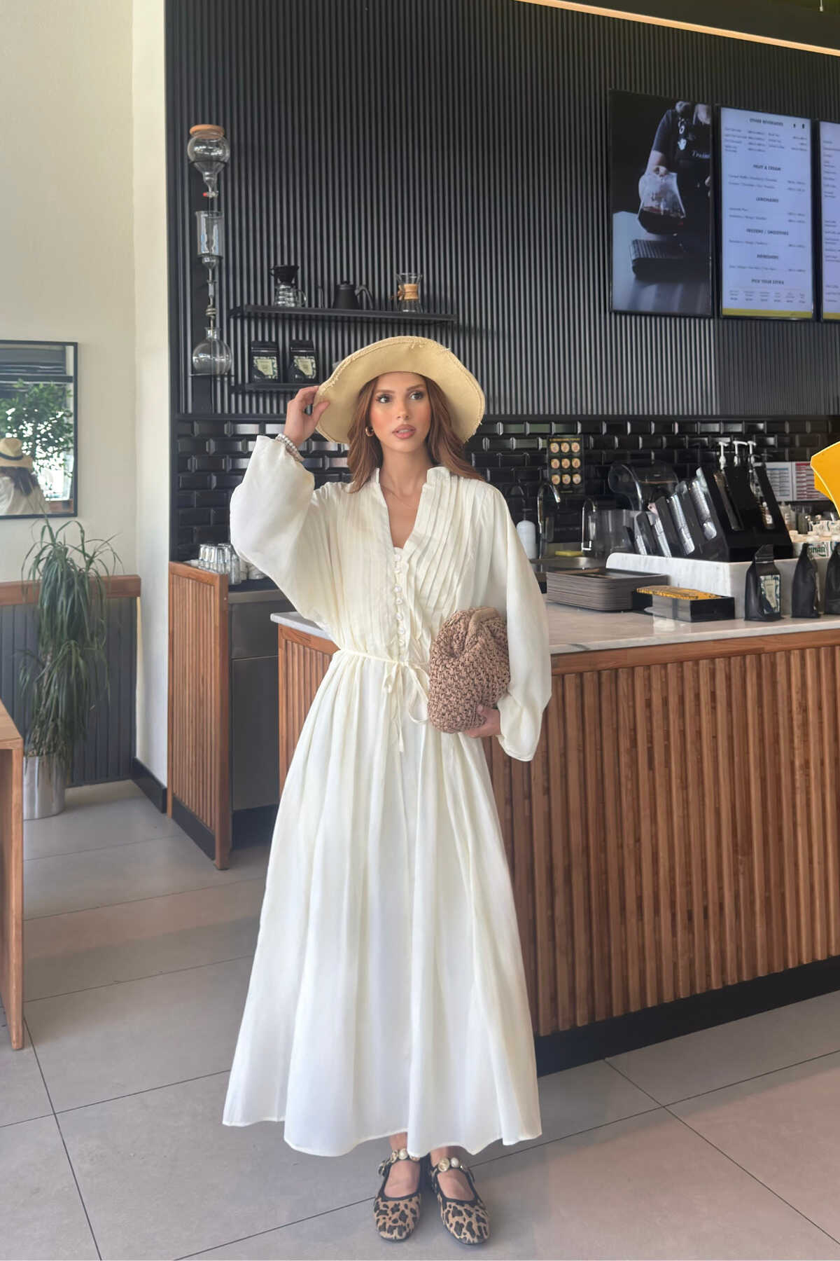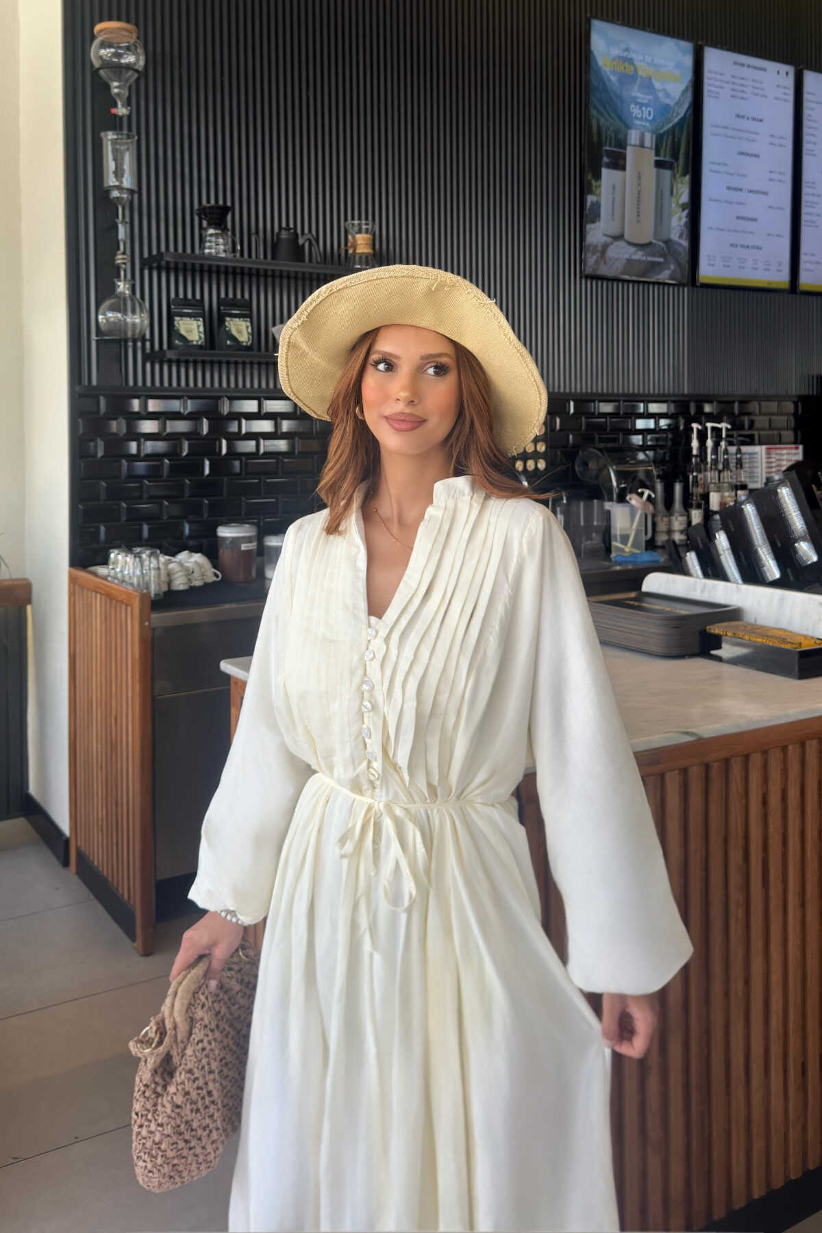 - Doğal ve zarif yaz stilini yansıtan Lina Pliseli Bohem Elbise, tesettür giyim koleksiyonunun şıklığını ön plana çıkarır.; - Basic silueti ile her vücut tipine uyum sağlayarak rahat bir kullanım sunar.; - Kemer detayı sayesinde belinizi vurgulayarak feminen bir görünüm kazandırır.; - V yaka tasarımı ile modern ve sofistike bir duruş sergiler.; - Smart persona özelliğiyle günlük kullanımdan özel davetlere kadar geniş bir yelpazede tercih edilebilir.; - Sürdürülebilir malzemelerden üretilmiş olup çevre dostu bir seçimdir.; - Yetişkin yaş grubuna hitap eden geniş beden skalasıyla herkes için idealdir.; - Şifon dokuma tipi hafifliği ve nefes alabilir yapısıyla yaz ayları için mükemmeldir.; - Astarlı yapısı sayesinde iç göstermez ve konforlu bir deneyim sunar.; - %100 pamuk materyali cildinizle dosttur ve uzun süreli kullanım için dayanıklılık sağlar.; - Fırfırlı detaylarıyla hareketli ve enerjik bir hava katarken aynı zamanda feminen çizgilere sahiptir.; - Yaz sezonunun vazgeçilmezi olan bu elbise, hem gündüz hem de gece ortamlarında şıklığınızdan ödün vermeden tarzınızı tamamlamanız için idealdir.; - Hassas yıkama talimatlarına uygun şekilde 30 derecede hassas programda yıkanabilir; böylece elbisenizin ilk günkü gibi kalmasını sağlayabilirsiniz.; - Kutusuz olarak sunulan bu ürün, minimalist tasarım anlayışını benimseyenler için uygundur.; - Cepsiz yapısı pratik kullanım imkanı tanırken mono kapama detayı kolay giyip çıkarmaya olanak sağlar.; - Dokuma kumaşı kaliteli hissiyat vererek dayanıklılık sunarken uzun süreli kullanım vaat eder.; - Kadın ve kız kullanıcılarına hitap eden zarif tasarımla her ortamda göz alıcı olmanız mümkündür.; - Kloş kalıbıyla rahat hareket etme özgürlüğü sunarken uzun boyu sayesinde şık duruşunu korur.; - Pamuklu materyali terletmez ve cilt dostudur; yaz aylarında serinlik hissi verir.